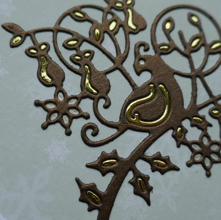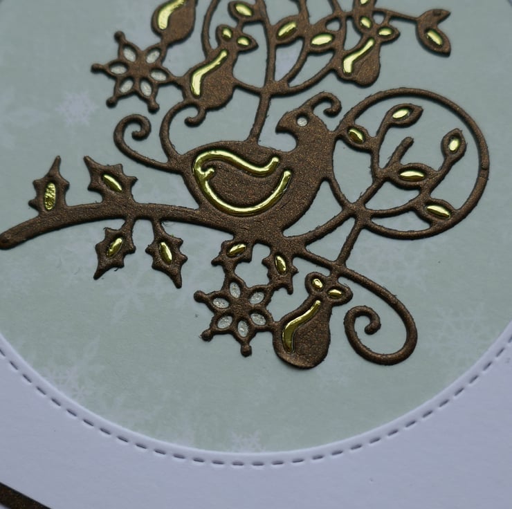 A panel of white card has been layered onto brown card and has a stitched circle aperture in the centre. Behind the aperture is a piece of pale green paper decorated with white snowflakes. A partridge in a pear tree has been die cut from brown card and attached to the centre with the small areas of the pears, leaves and partridge inlaid with gold card. The snowflakes and partridge's eye have been highlighted with a silver gel pen.