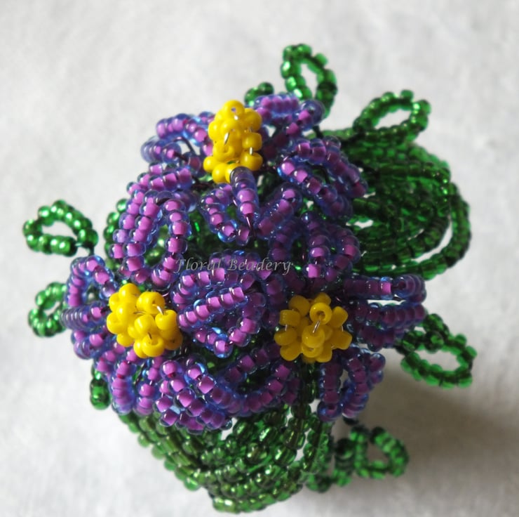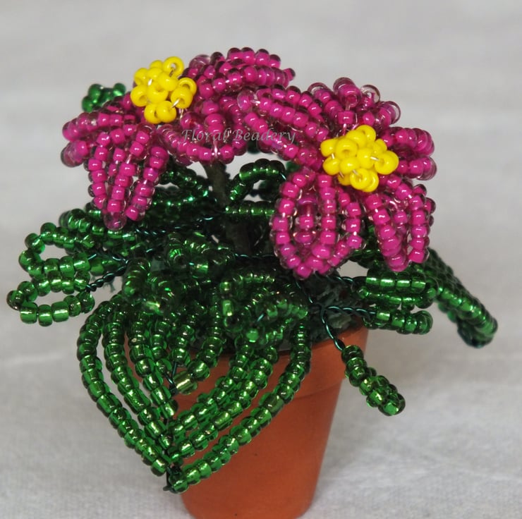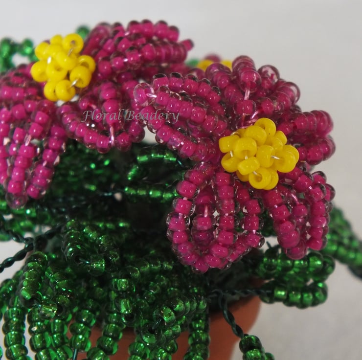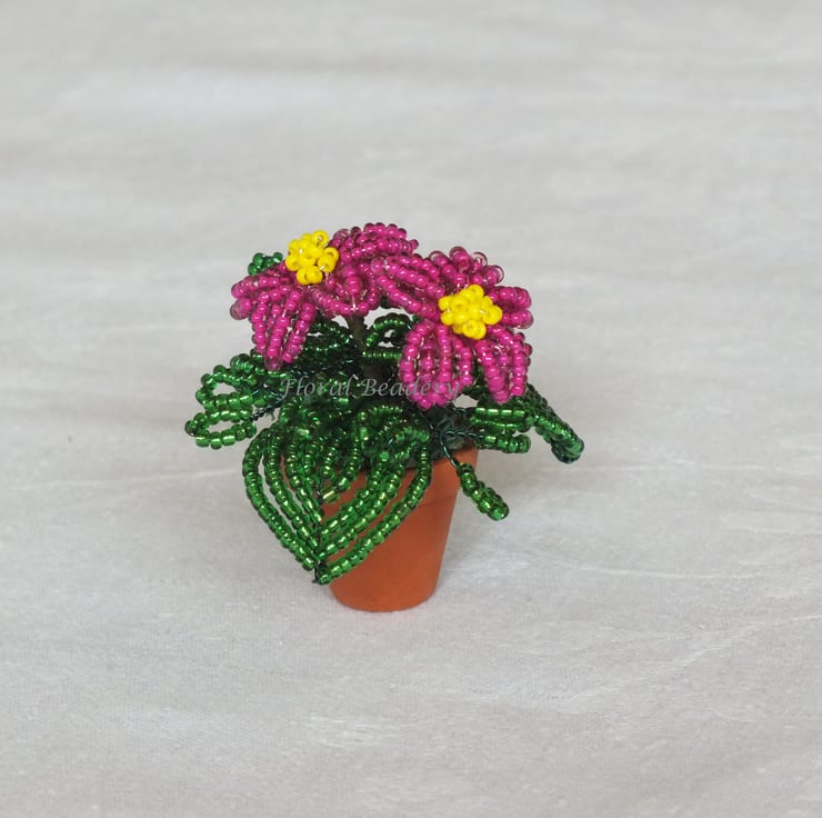 The flowers and leaves are made from wire and tiny glass seed beads. floral tape helps to keep the flowers and leaves together before being set in plasticine in the miniature pot.