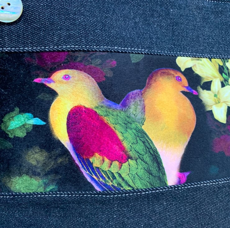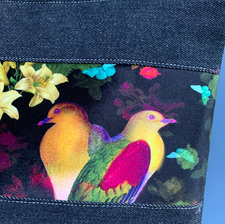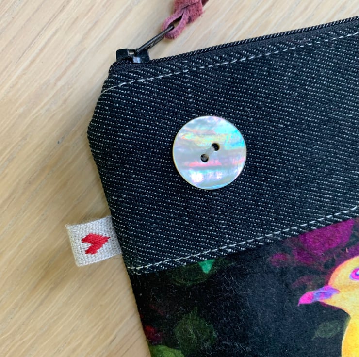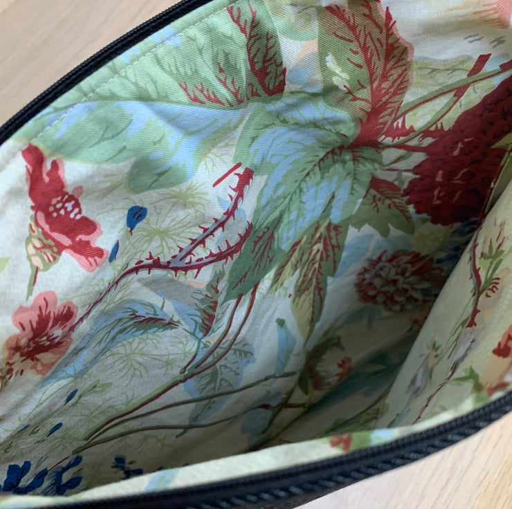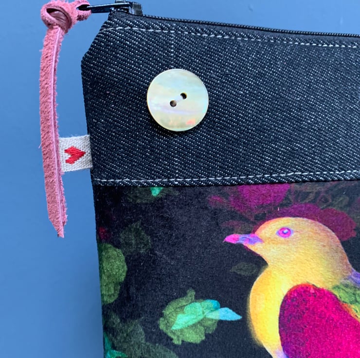 Marianne Ley Design Paradiso velvet. The pouch is beautifully lined with reclaimed floral cotton. A layer of interfacing gives some protection to the contents. It is finished with a mother of pearl button.