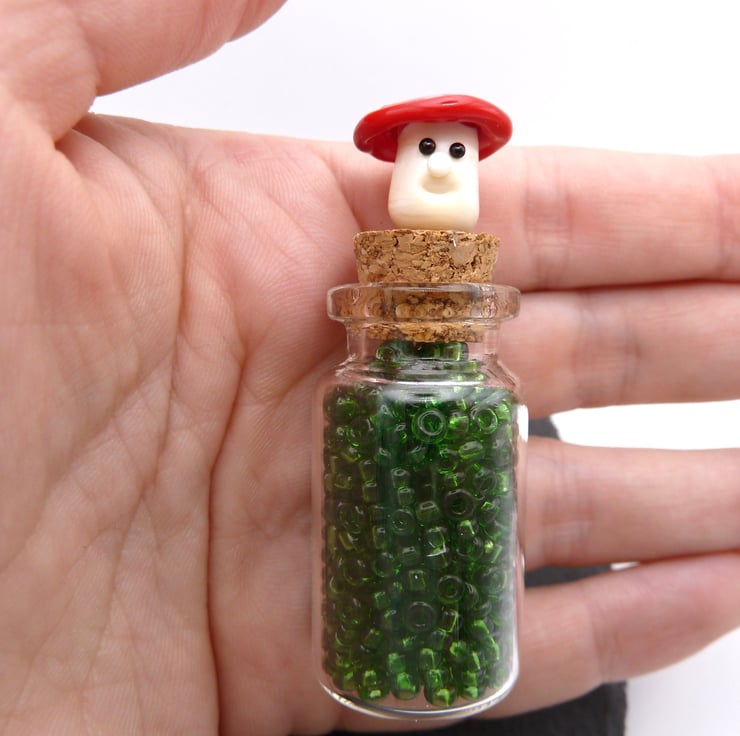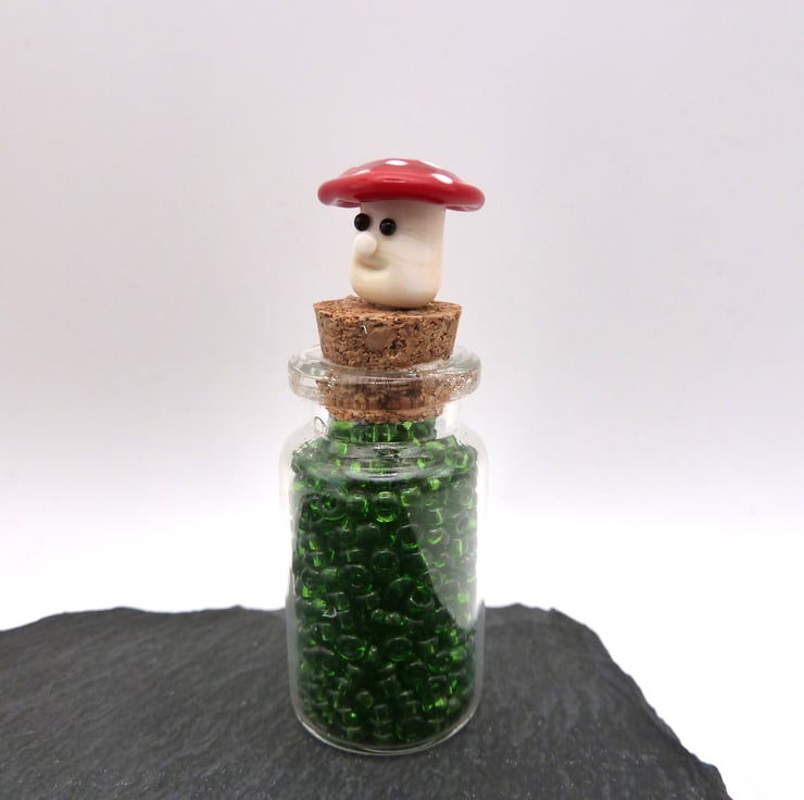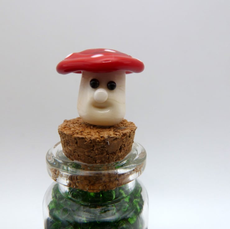 A glass bottle keepsake gift which features a small handmade glass toadstool on the top.