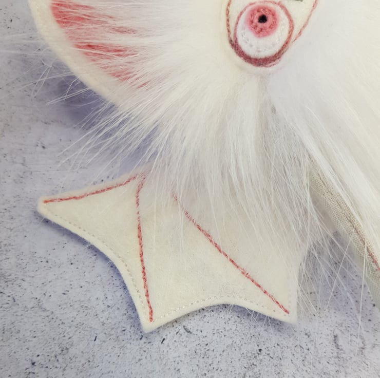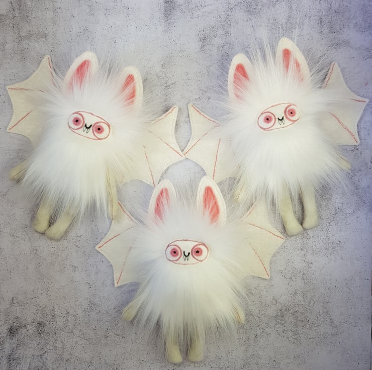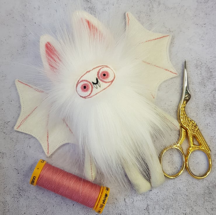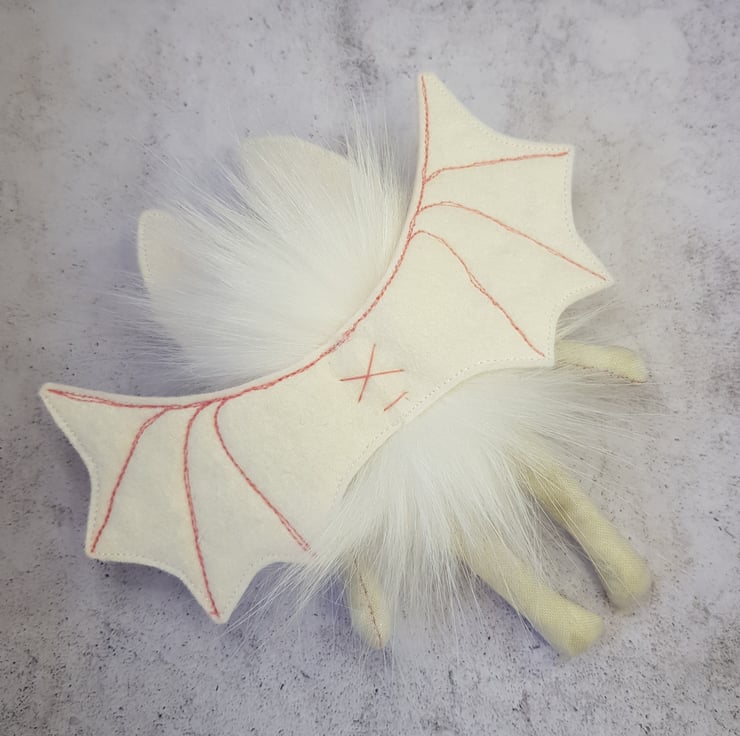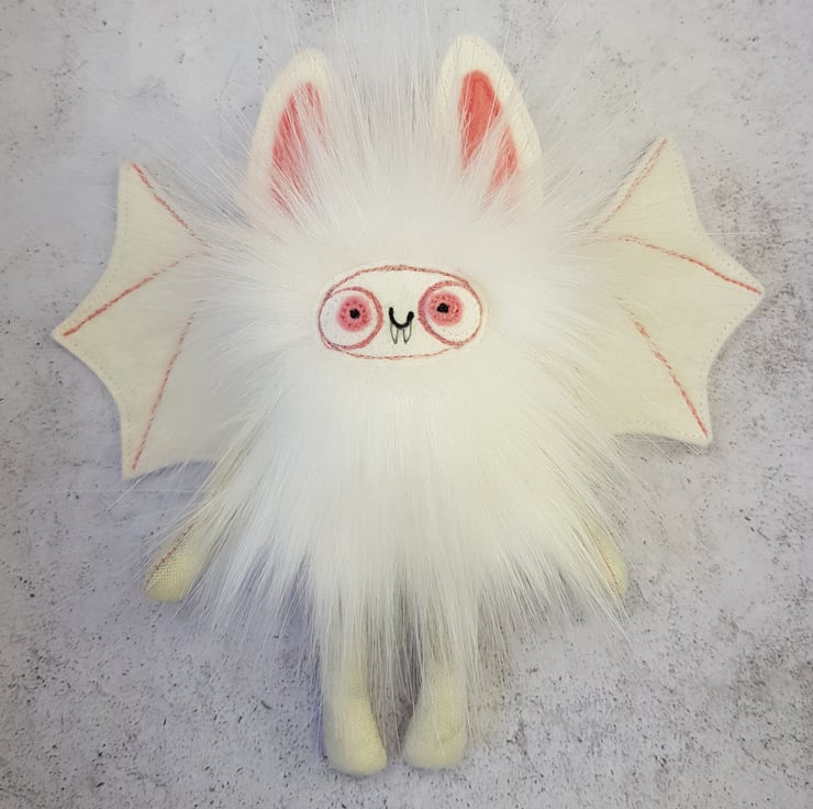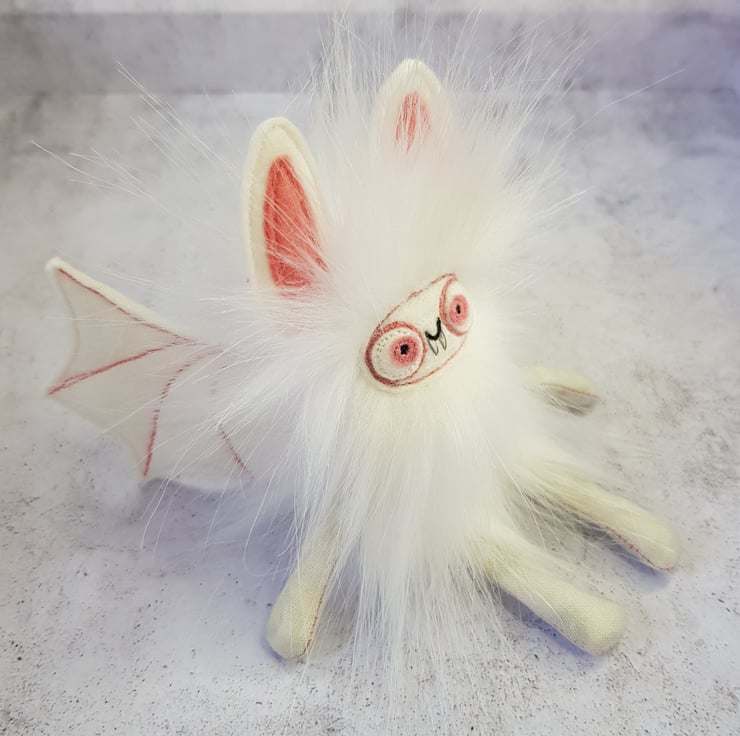 Bat art doll with free motion embroidered felt face and hand cut felt wings and ears. This art doll is made from the softest luxury faux fur with bumbleberries print cotton arms and legs. Bat measures roughly 15cm tall with a 15cm wingspan. Bat comes with a clear nylon thread hanger. These bats can be displayed from their hangers or can sit unaided by putting their wings behind them. Designed and created by myself in my home workshop in a coastal town in Pembrokeshire. This listing is for one bat only. This bat is not a toy and meant for decorative purposes only. Sent in recyclable and recycled packaging.
