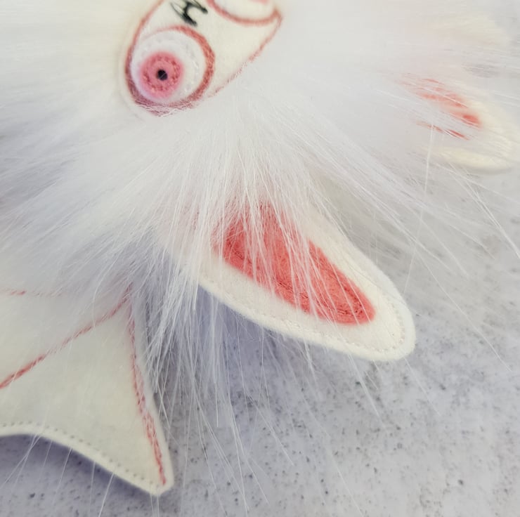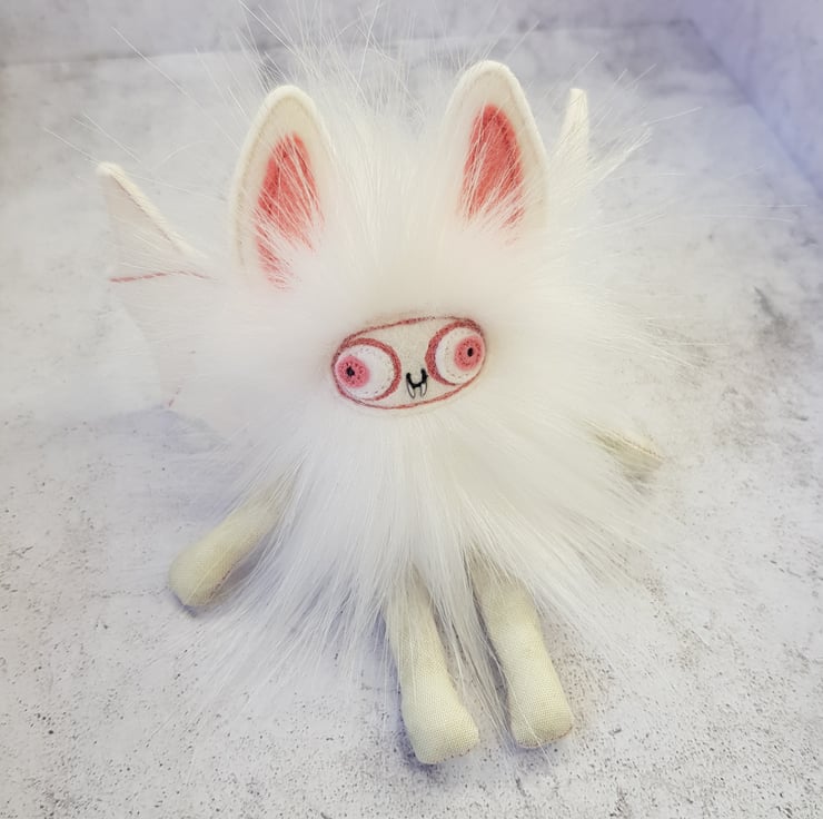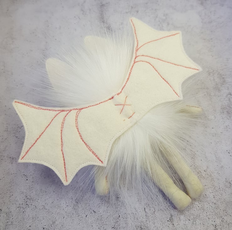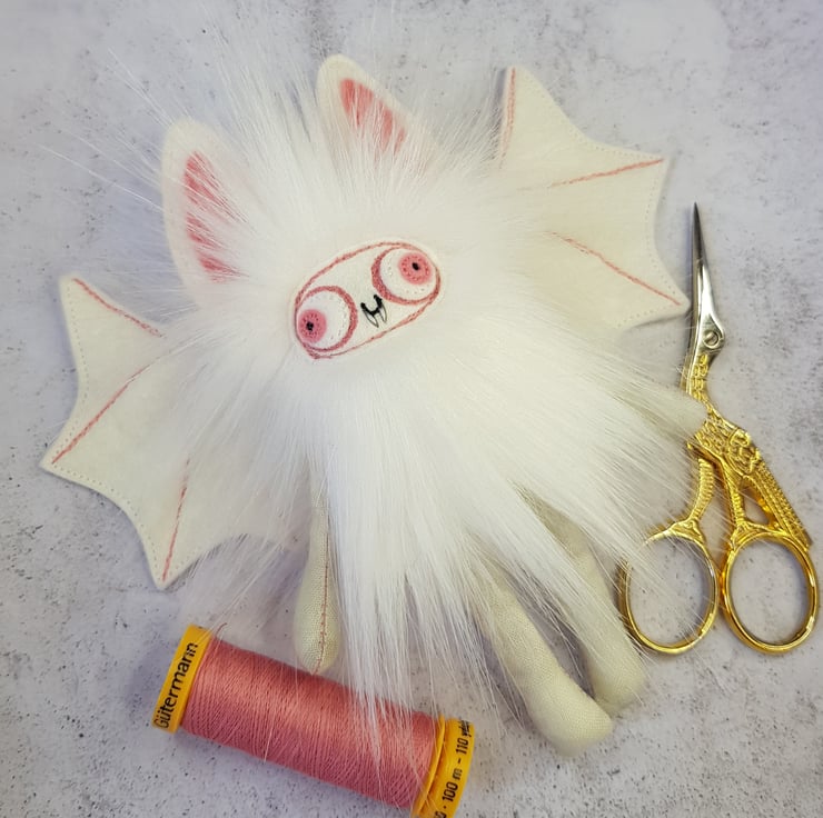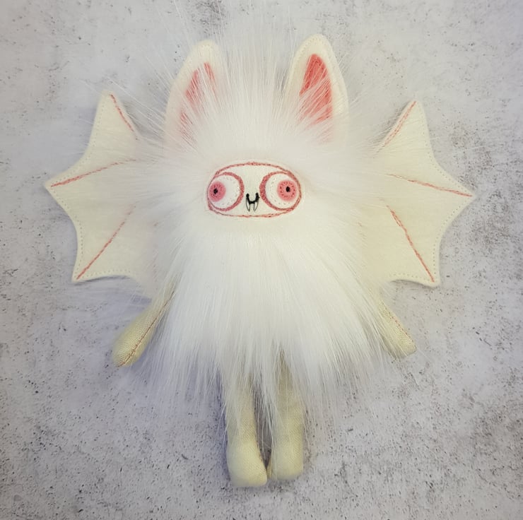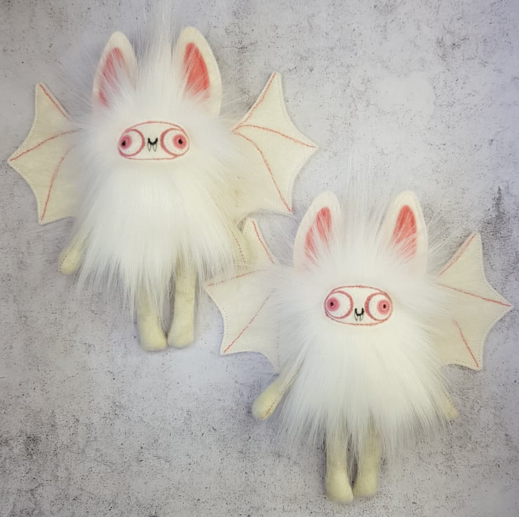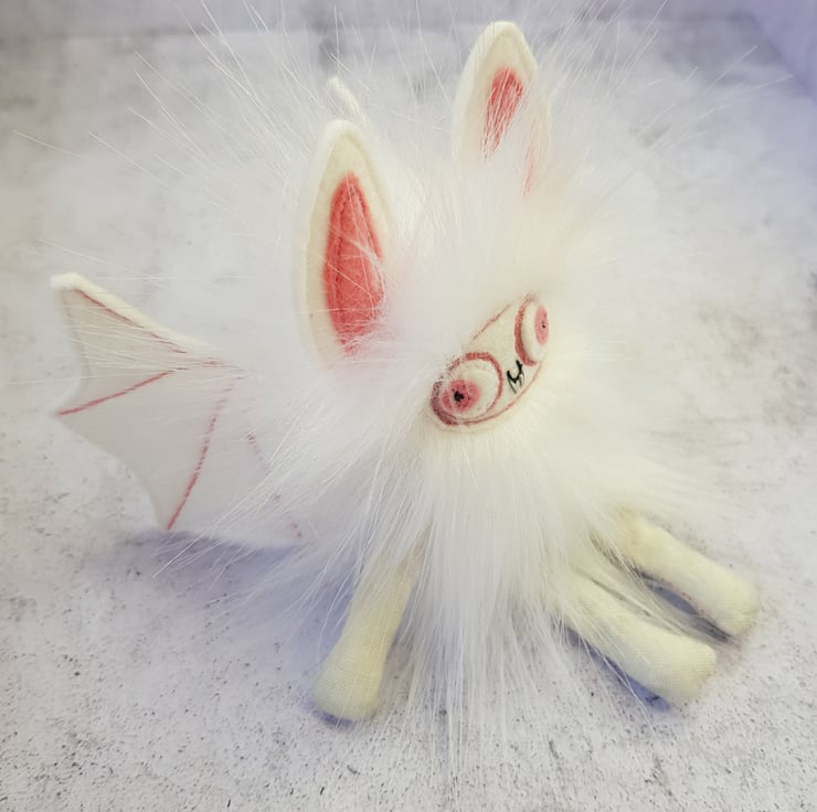 Bat art doll with free motion embroidered felt face and hand cut felt wings and ears. This art doll is made from the softest luxury faux fur with bumbleberries print cotton arms and legs. Bat measures roughly 15cm tall with a 15cm wingspan. Bat comes with a clear nylon thread hanger. These bats can be displayed from their hangers or can sit unaided by putting their wings behind them. Designed and created by myself in my home workshop in a coastal town in Pembrokeshire. This listing is for one bat only. This bat is not a toy and meant for decorative purposes only. Sent in recyclable and recycled packaging.