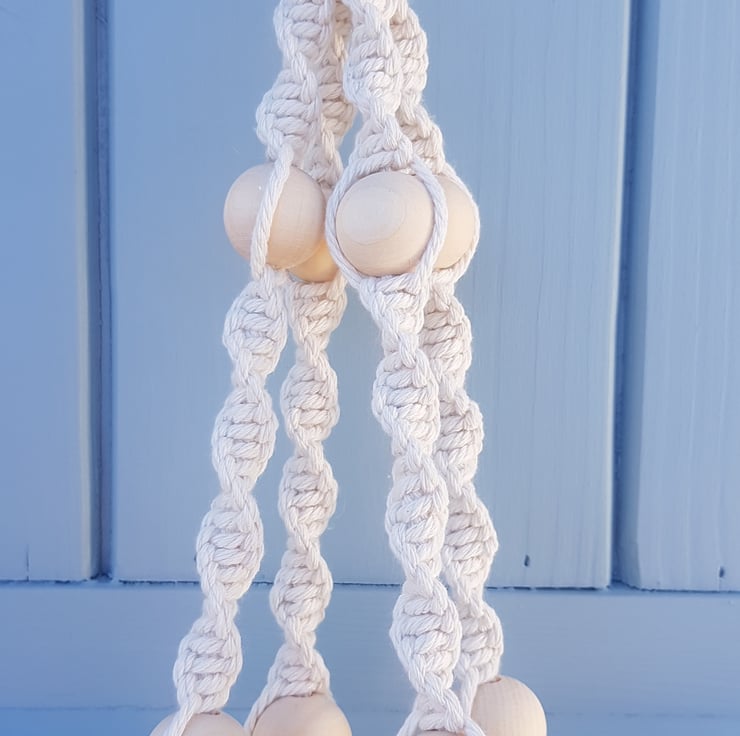 .A neutral handmade hanging basket, made using 100% pure cotton cord of a natural coloir, with natural wooden beads and a natural wooden ring to hang the basket from.