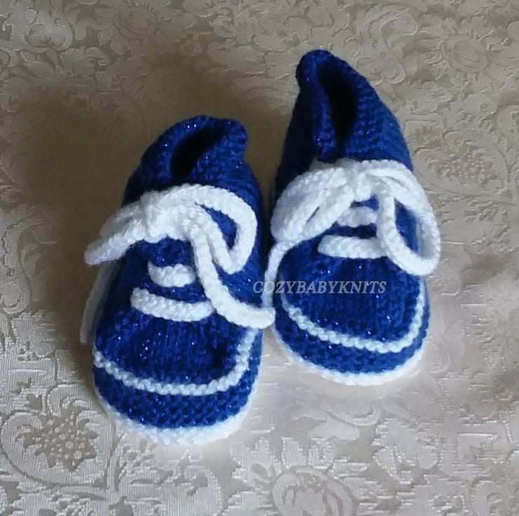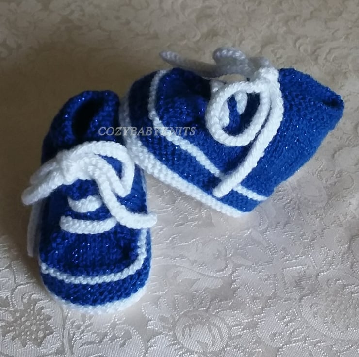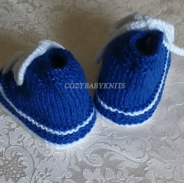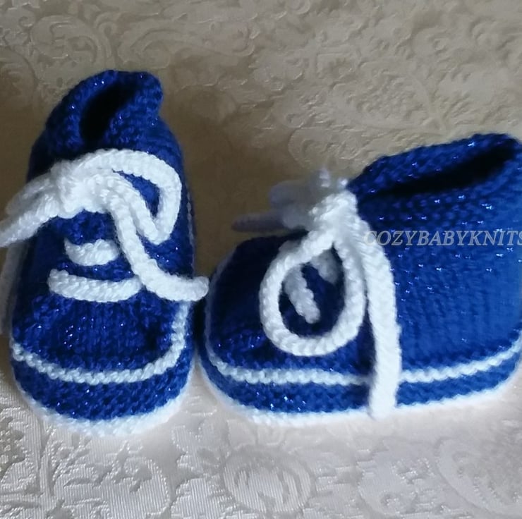 0 - 3 months size. Knitted in a soft double knit. The wool has a glitter thread that makes them perfect for that outfit or that special occasion.