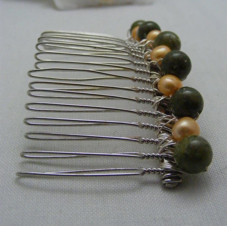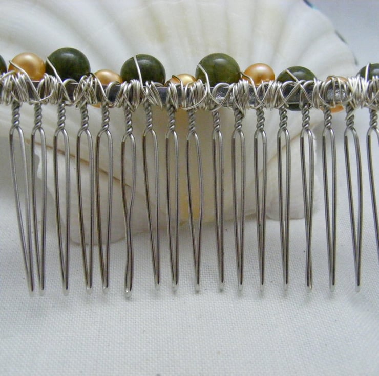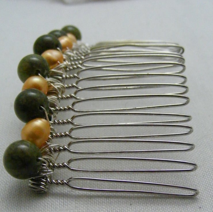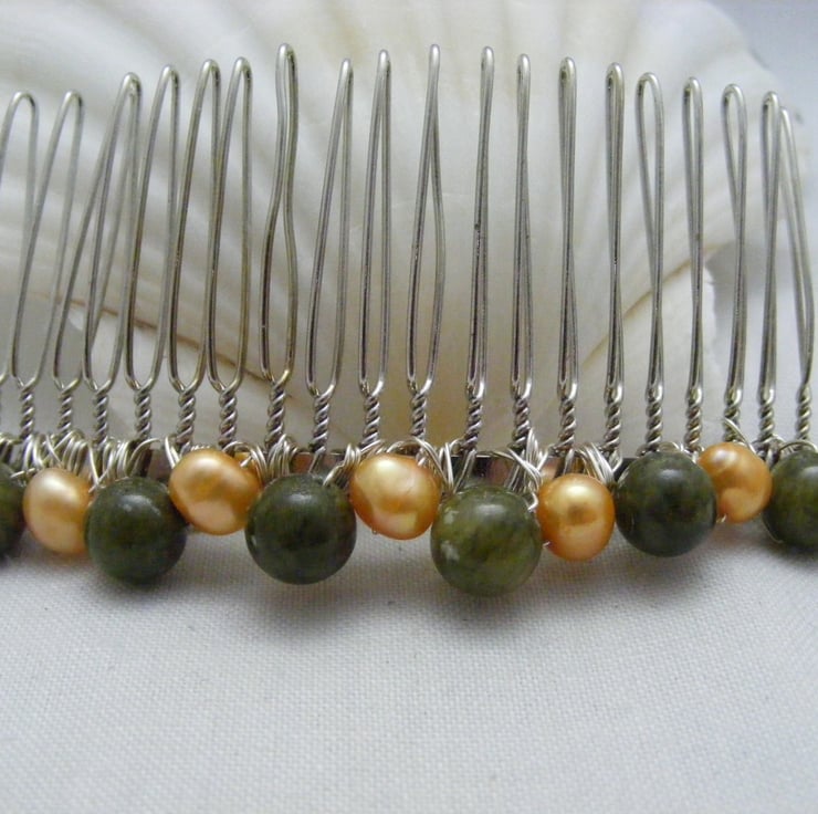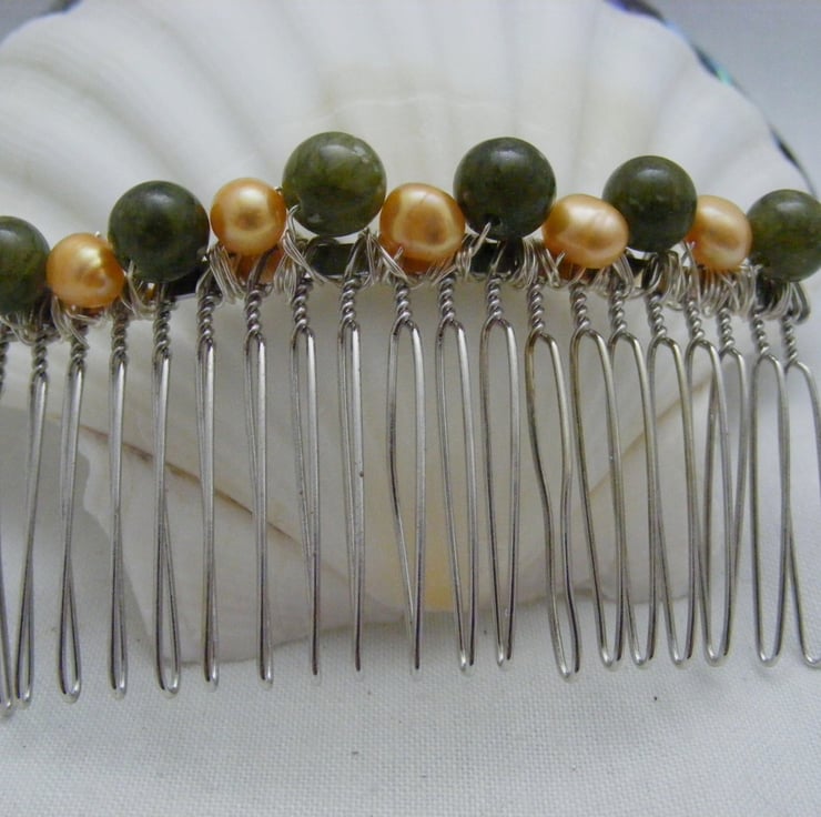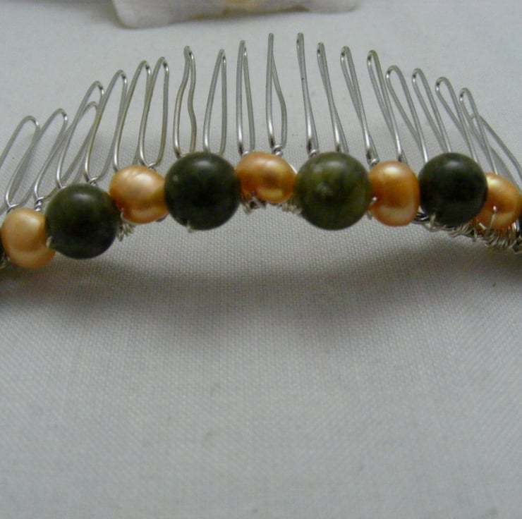 6x7mm orange freshwater pearls, 8mm olive jade beads and silver plated wire for wrapping the beads onto the comb.