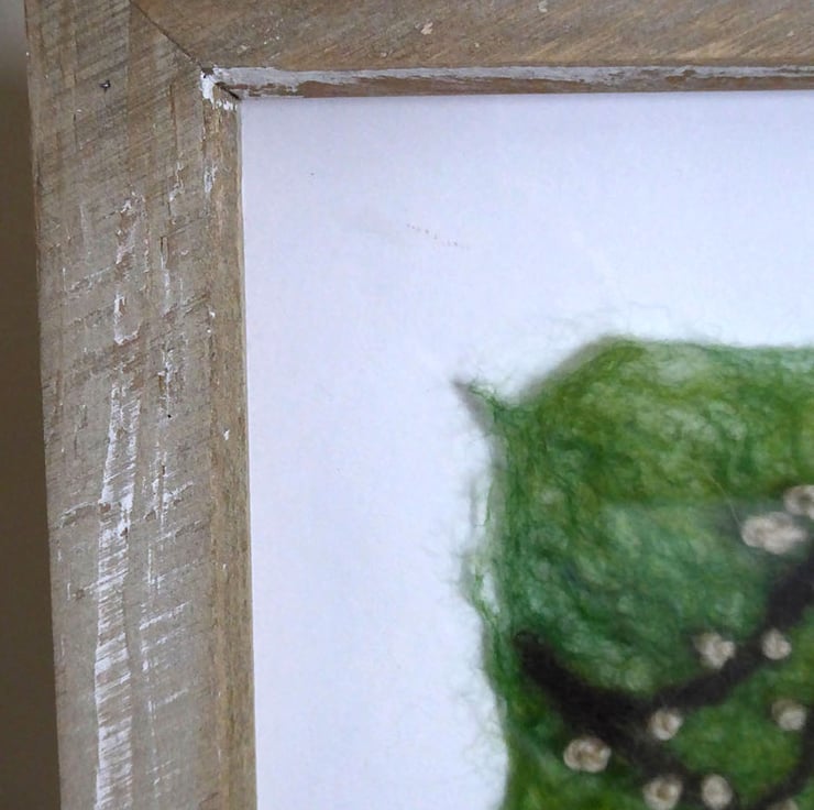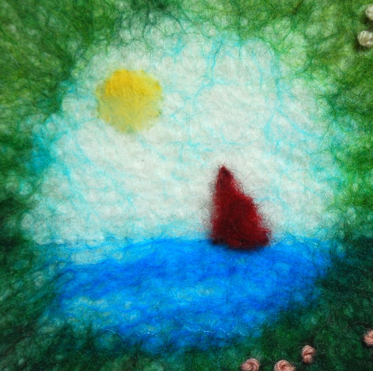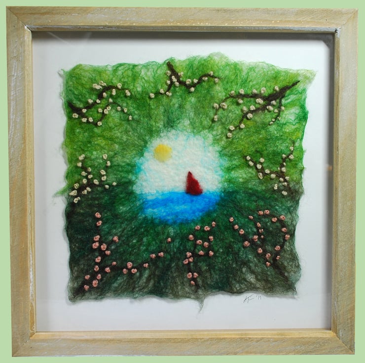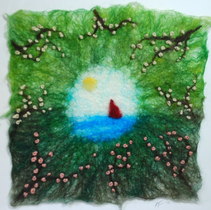 The background is wet felted. It is a process that involves laying down multiple layers of raw un-spun merino wool, which is then moistened and repeatedly rolled until all the wool fibres mesh or 'felt' together. I don’t completely felt the wool so that individual fibres are still visible and add texture to the image. Once dry I added the elements of the scene (wet felted pieces) via needle felting and hand embroidered the pink blossom.