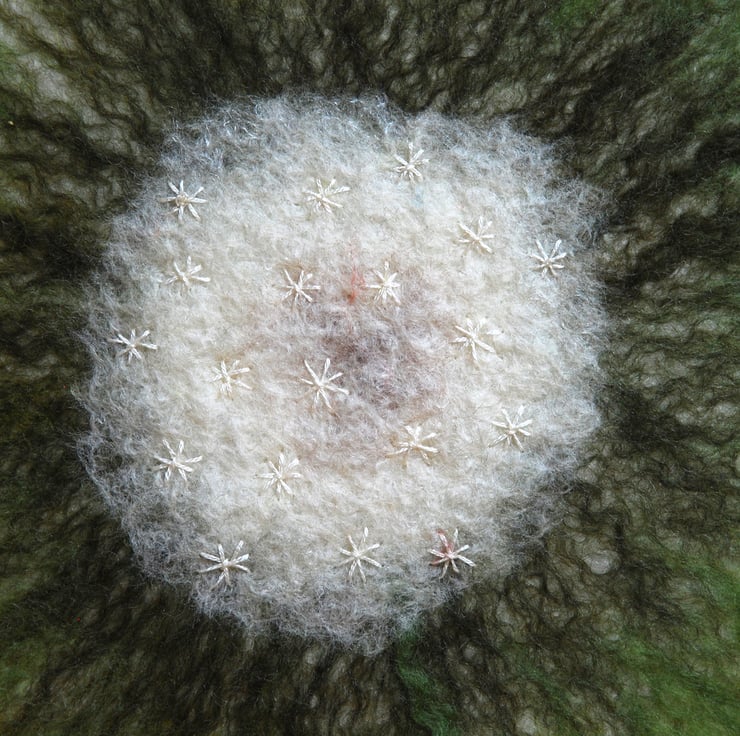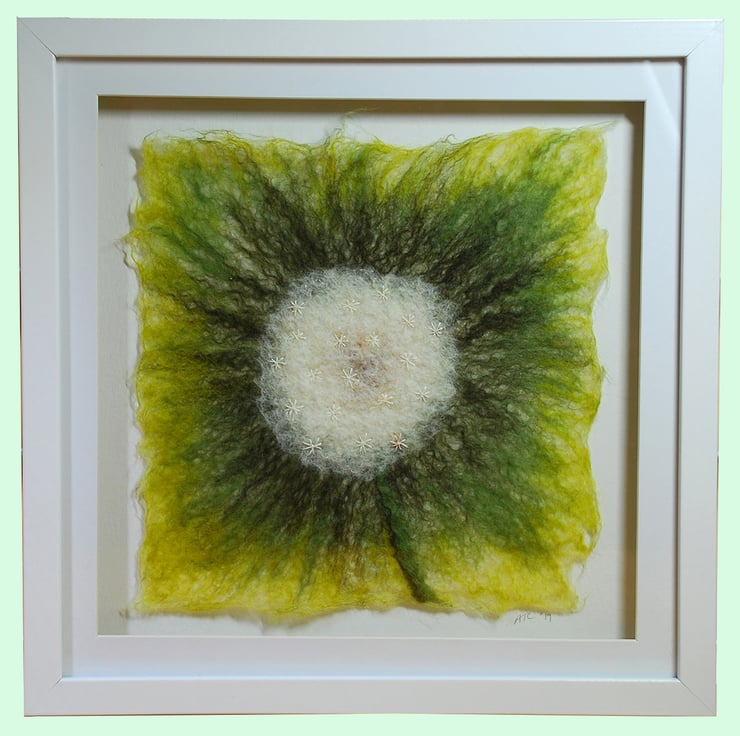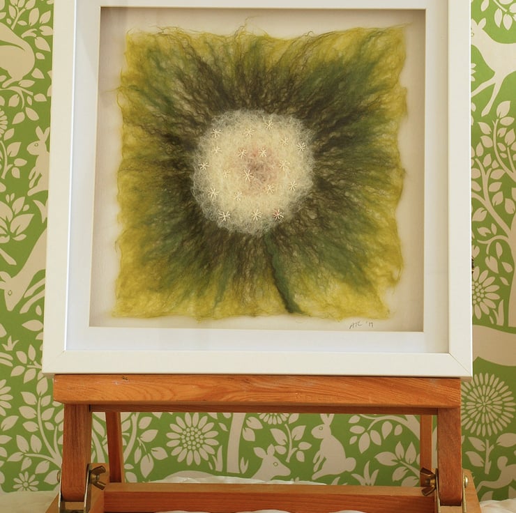 Merino wool felt picture of a delicate dandelion seed head on a mottled mid green background.