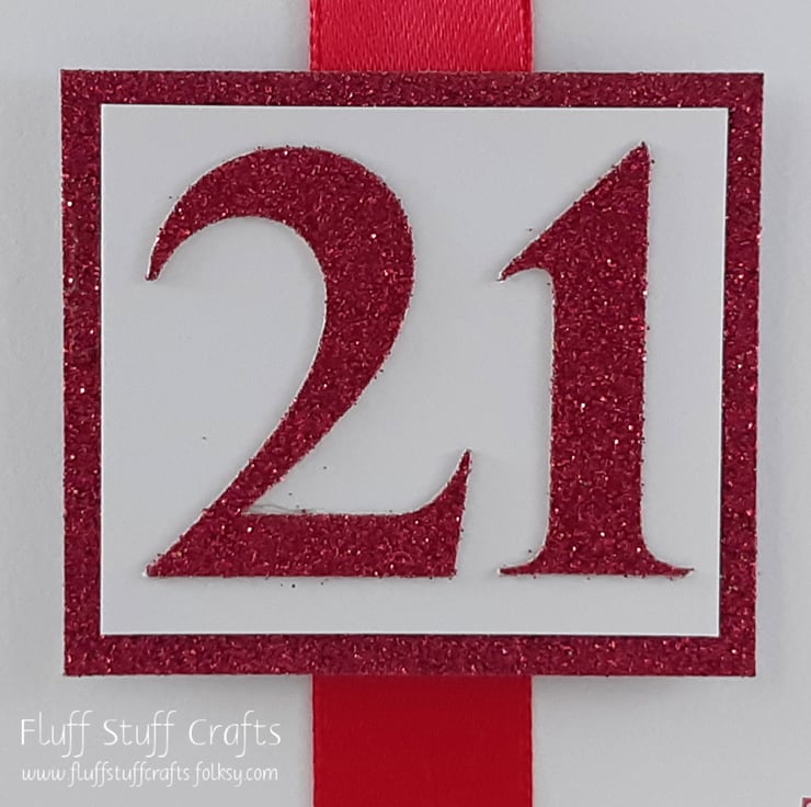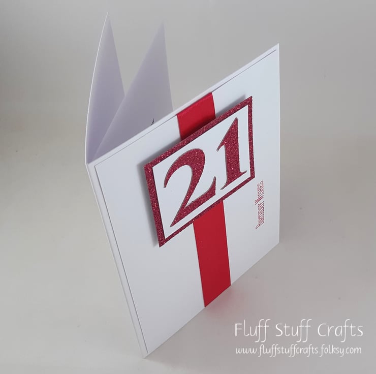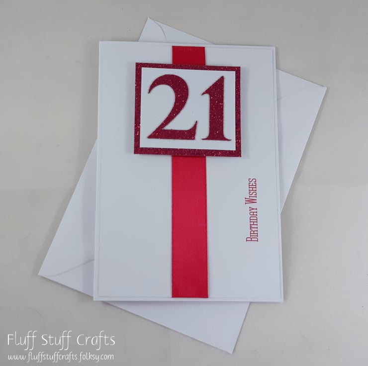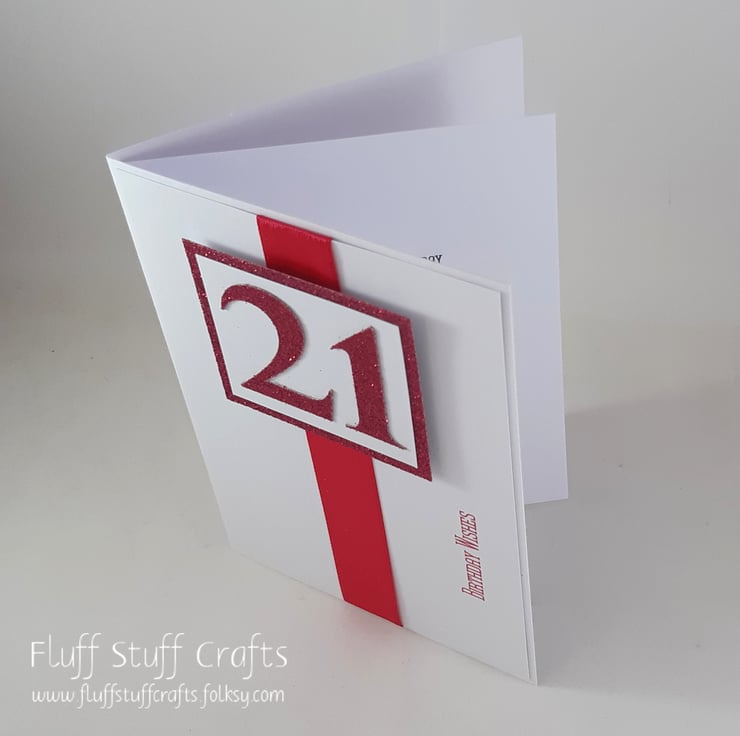 A6 sized 21st birthday card. The card features a number 21, die cut from pink glitter card, overlaid onto white card on pink glitter card. This sits on top of a length of pink satin ribbon on a white background with the sentiment 'Birthday Wishes' printed in pink ink.