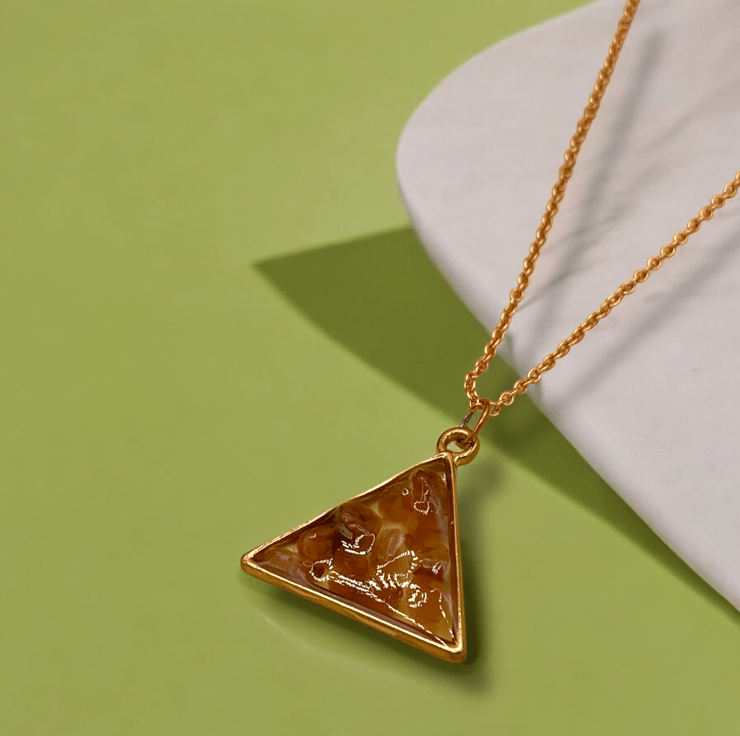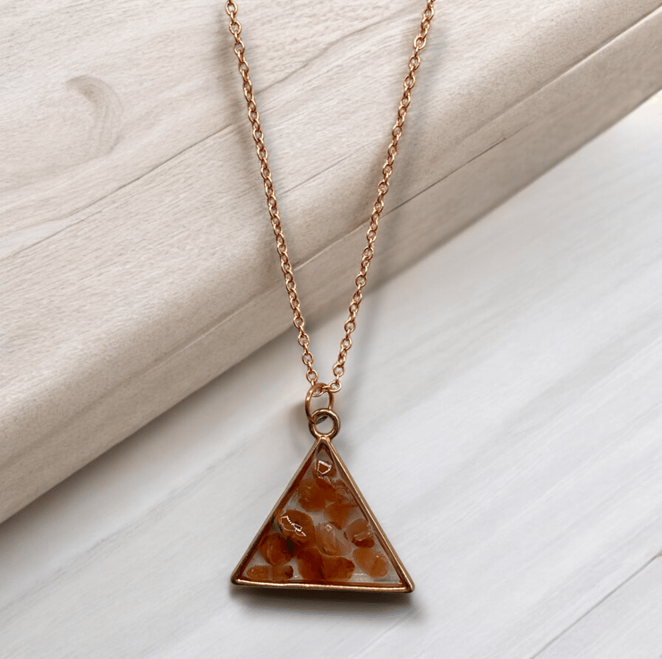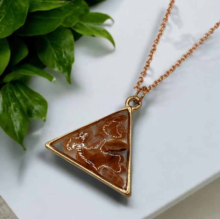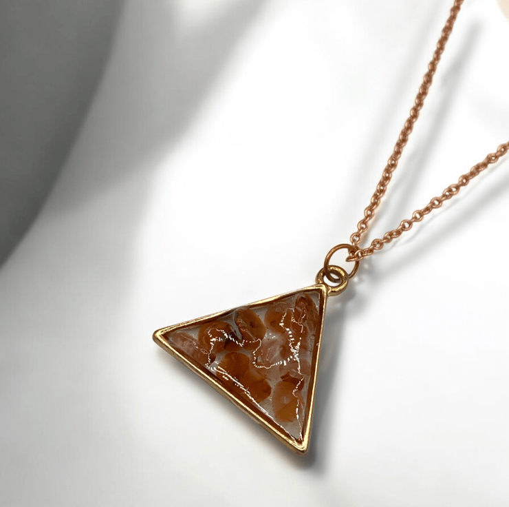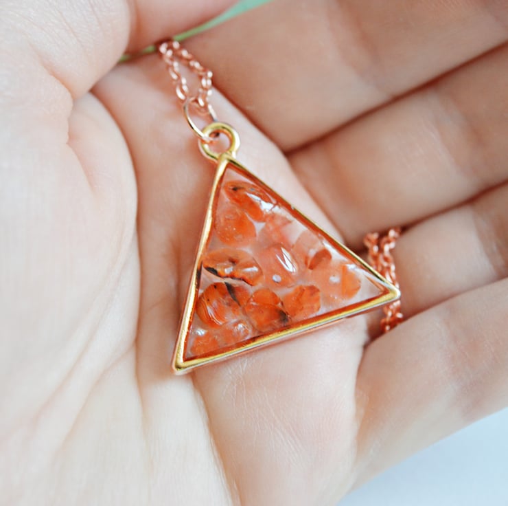 Handmade with Genuine Natural Carnelian chips. The tiny nuggets are cured within Vegan Friendly Eco Resin in an open Rose Gold plated Triangle bezel, as the focal point of this