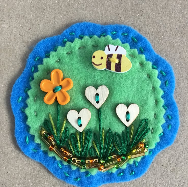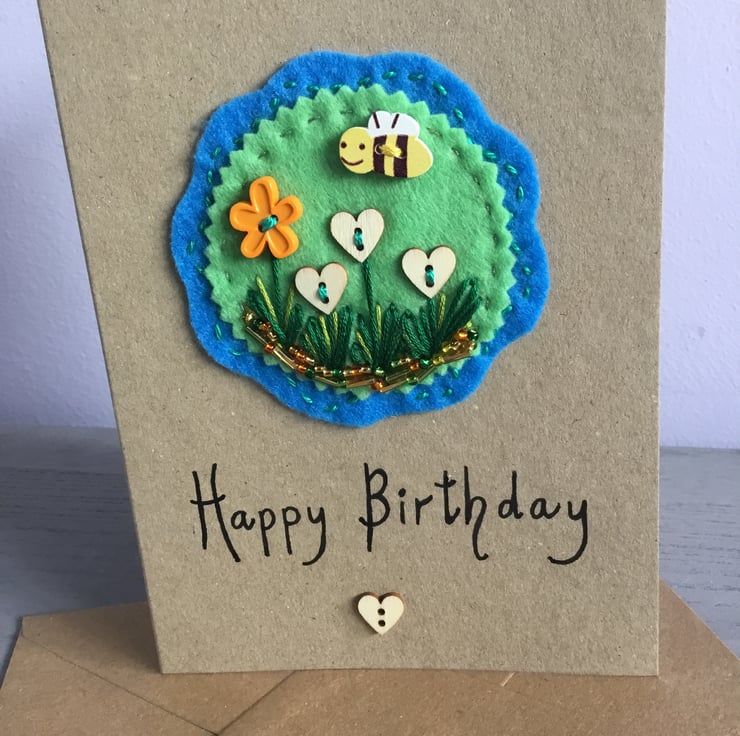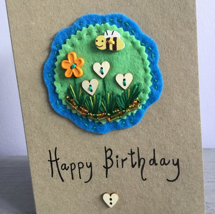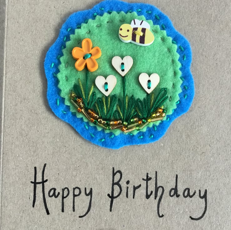 This Embroidered Heartfelt Bee Birthday Card has a Summer scene embroidered onto circles of pale green and turquoise blue felt. A wooden bee button buzzers over a border of flowers.....an orange flower button and three wooden heart flowers stand in a row, their stems and leaves are hand embroidered in long and short Straight Stitches with bugle and glass beads in golden, green and orange.