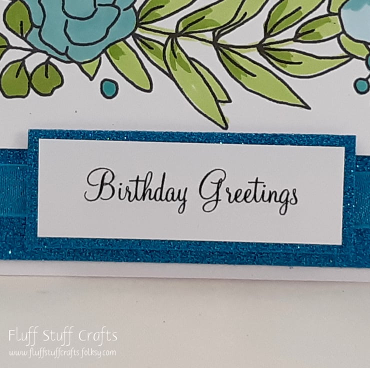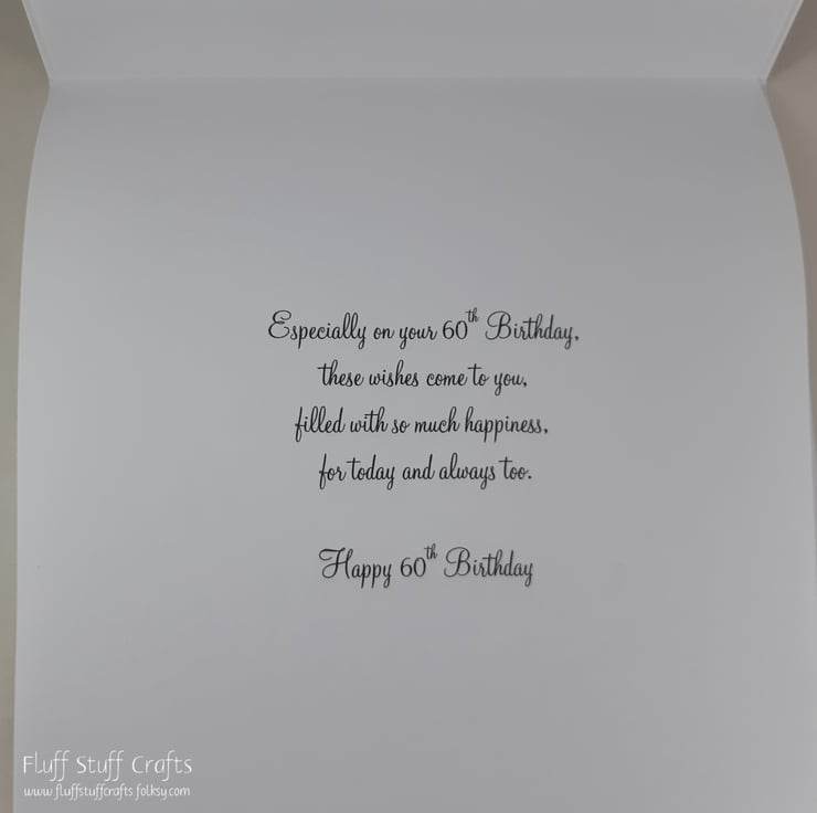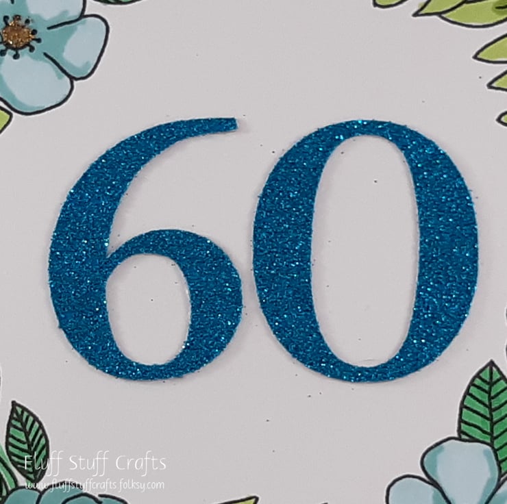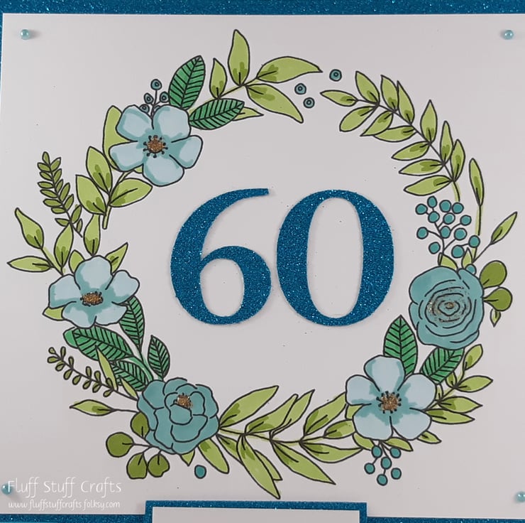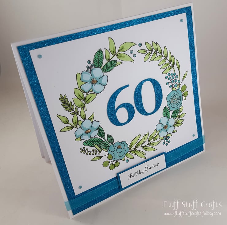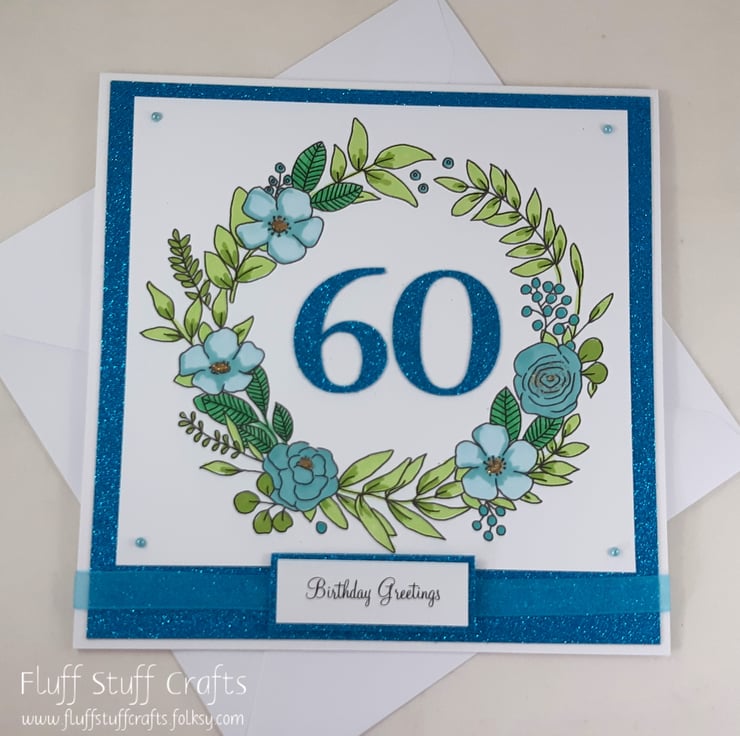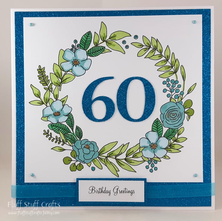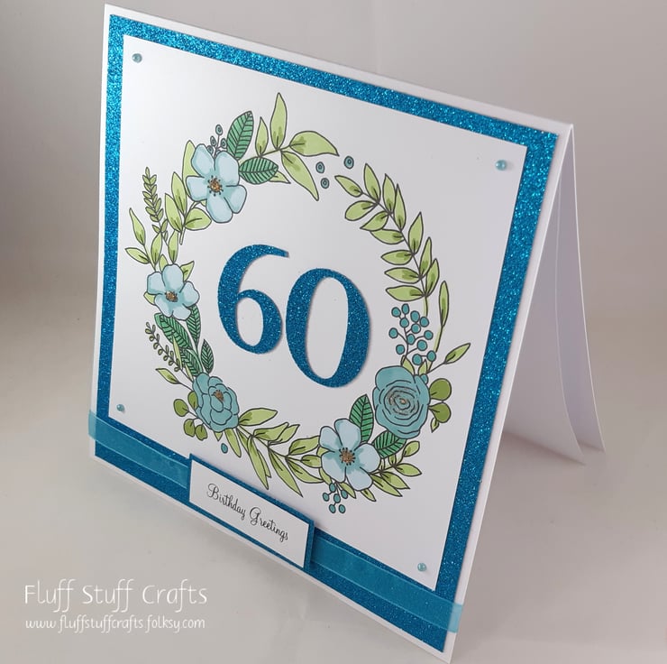 Large, square 60th birthday card. The card features a hand coloured flower wreath with teal coloured flowers. In the centre is the number 60, die cut from teal glittered card. The image is mounted on the same glittered card and embellished with 4 small pearl gems in the corners. The sentiment reads 'Birthday Greetings' and is also mounted on the same glittered card, over a length of matching organza ribbon.