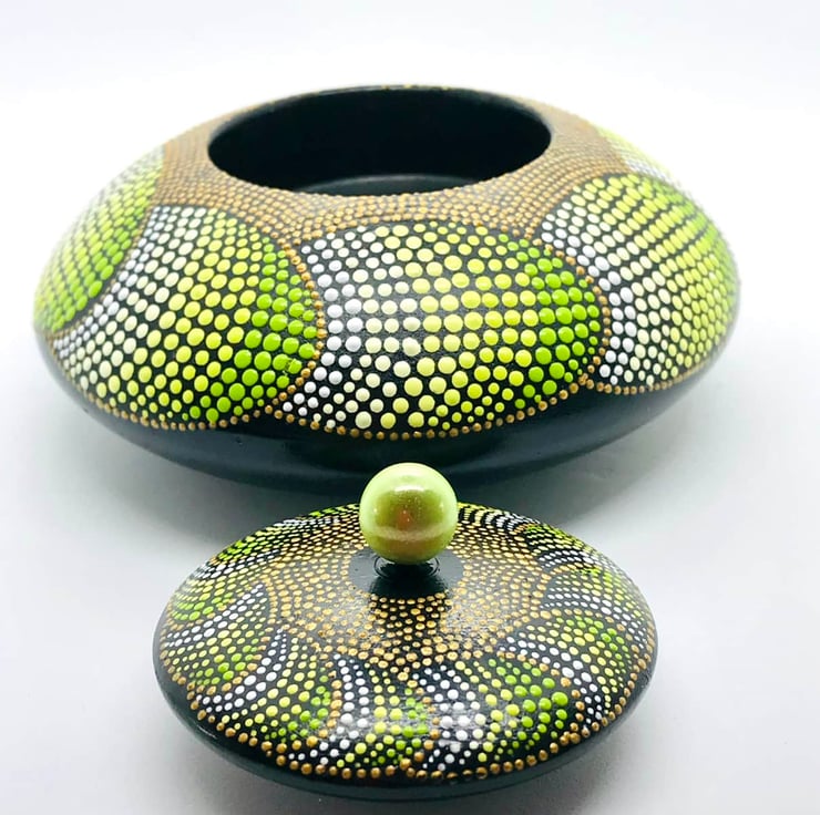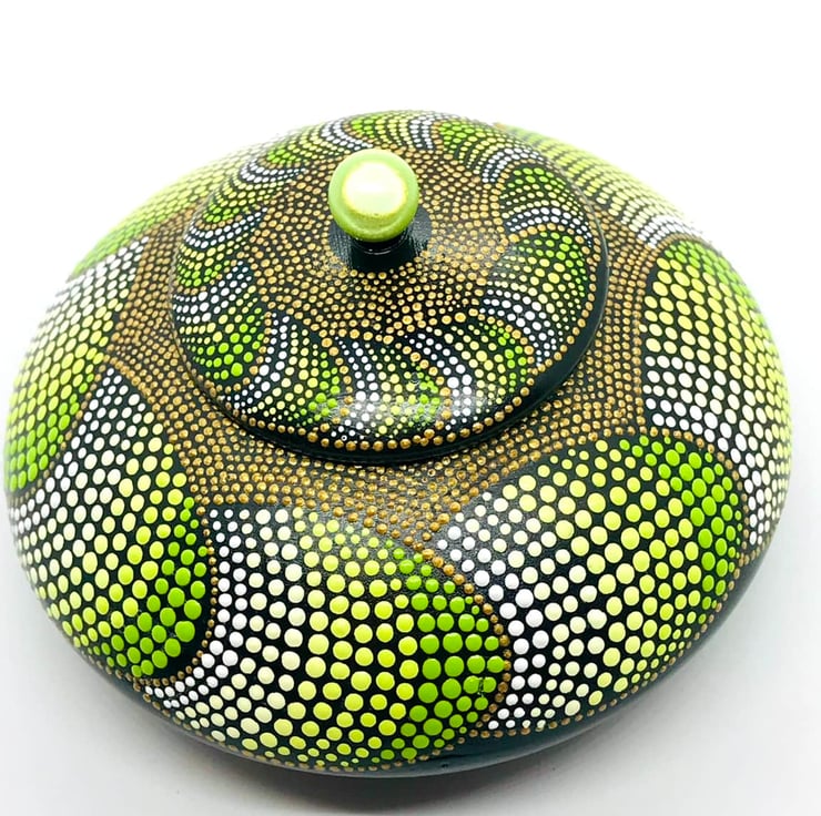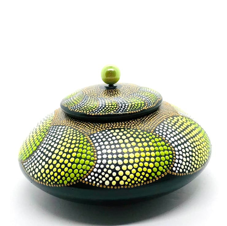 The lid is embellished with a lime-green “Miracle Bead” (so called because when it is placed in front of light (like on a windowsill) it shines so brightly and it looks as though there is another bead within it.