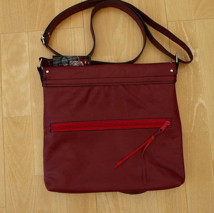 Leather crossbody bag deep red leather shoulder bag with poppy lining and rivets