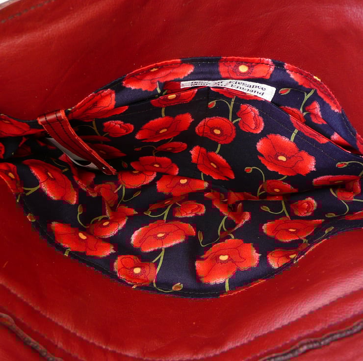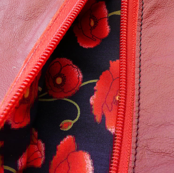 This is part of my new leather collection, this deep red leather crossbody bag is made from top quiality upholstery grade real leather which is soft, supple and super hardwearing. This shoulder bag features raw edges around the top of the bag and around the overflap, I have taken the natural shape of the hide for the over flap, so every bag will be slightly different. There are NO bag fasteners on this bag, the large riveted overflap keeps the bag closed, the bag base has a small gusset that is semi solid to give the bag structure. This crossbody bag features a zip pocket on the back, a large front over flap with double cap rivet detail, a slip pocket on the front under the over flap and a fully adjustable leather strap with a slide adjuster. Inside the bag is fully lined with a poppy cotton print and features 2 slip pckets and a key clip.
