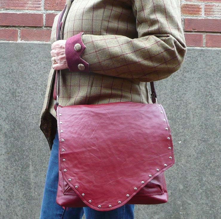 Leather crossbody bag rivet detail crossbody bag unisex bag shoulder bag deep red leather bag with poppy lining