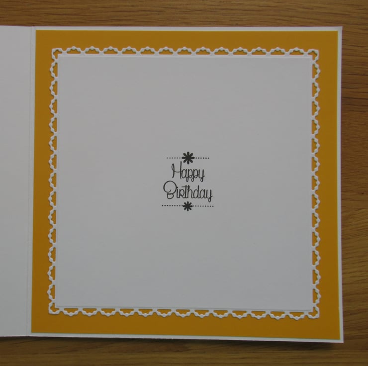 This lovely card features the image of 2 sparrows perched on a branch full with fruit and sits upon a peach coloured, polka dot background. Fancy edged dies have been used to frame the image and these are raised with 3D foam pads. The inside of the card is finished to coordinate with a simple stamped Happy Birthday greeting.