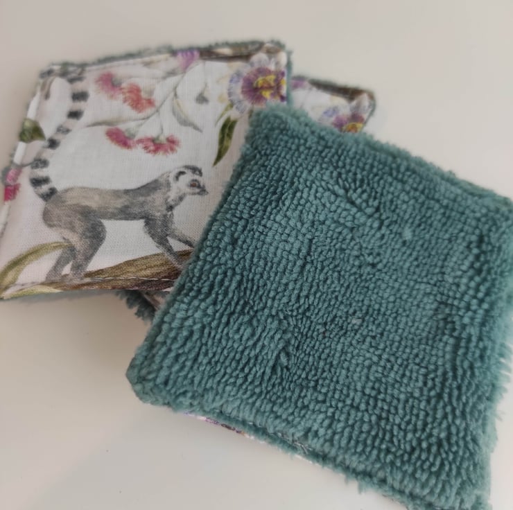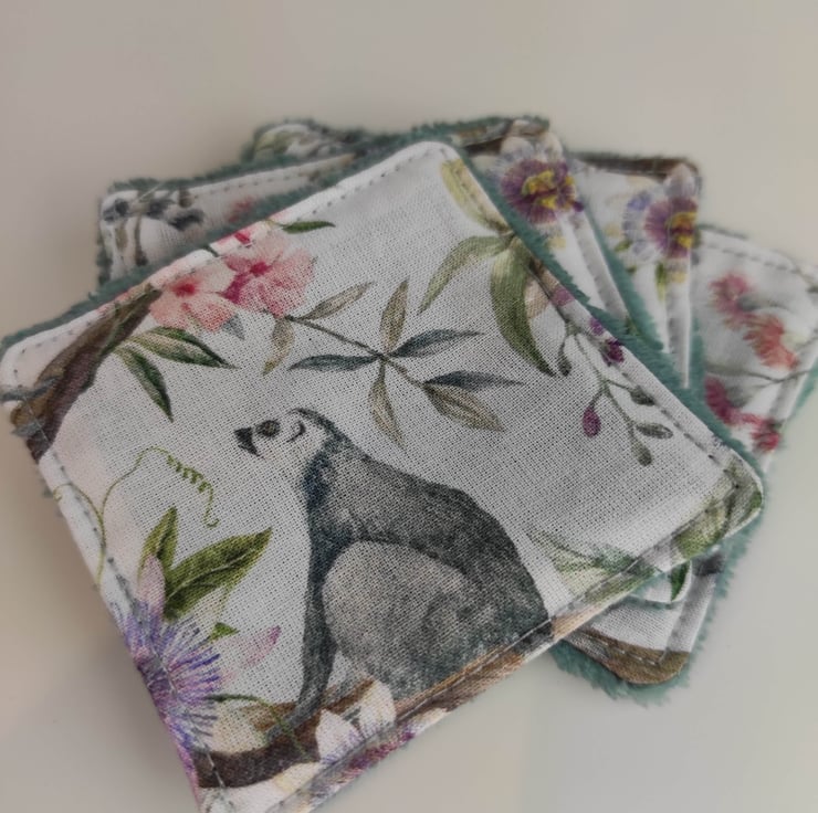 A set of four 3 inch square reusable face pads handmade 100% cotton fabrics and beautiful velvet bamboo towelling. This set features cheeky ring-tailed lemurs and passion flowers. These also have green towelling, which complements the fabric choice beautifully.