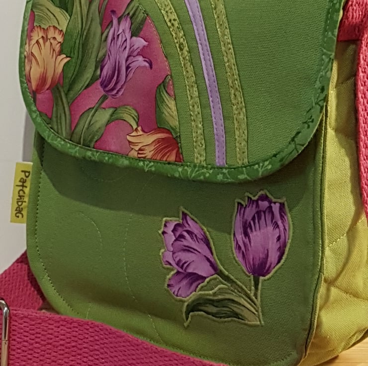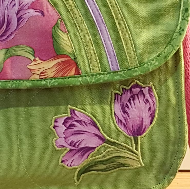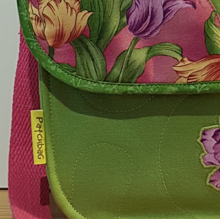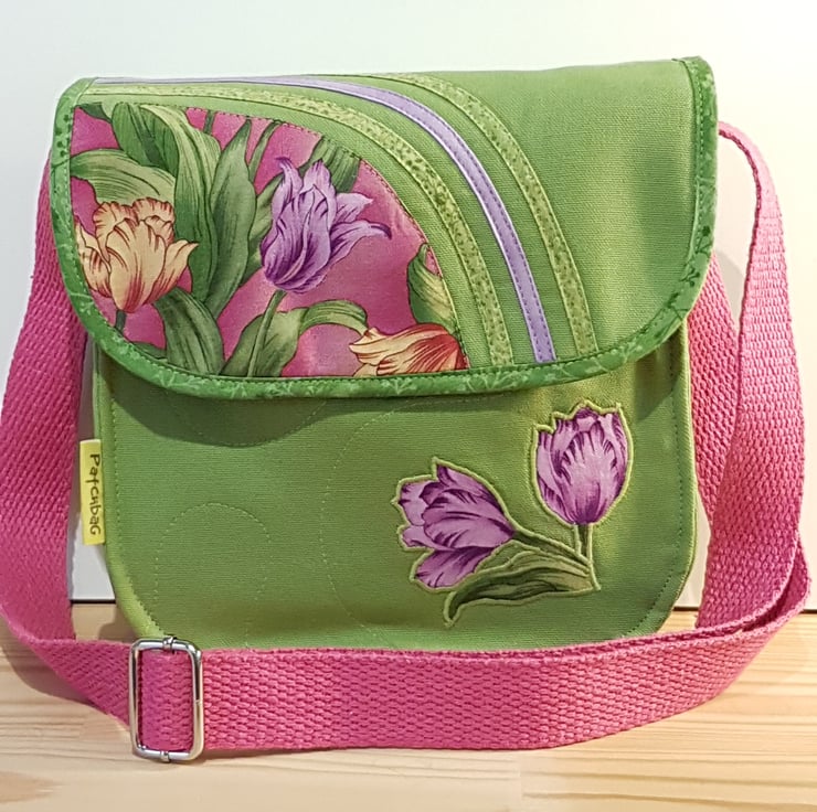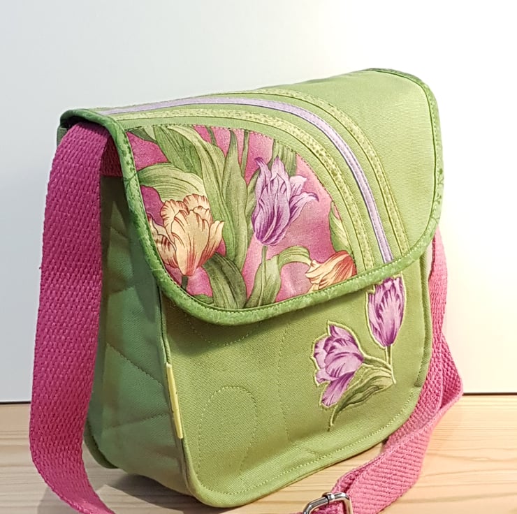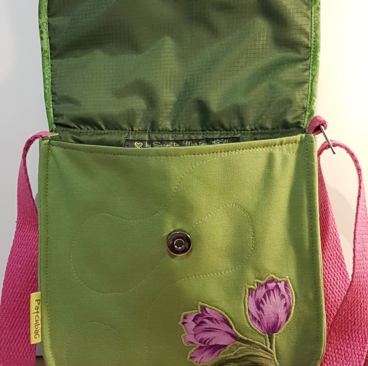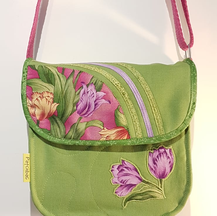 Lime green canvas patchwork and applique shoulder bag/ crossbody bag with lilac and yellow tulips pattern. The bag has adjustable shoulder strap. The main fabrics are cotton canvas and cotton ,the lining made from waterproof fabric. The shoulder bag closing with magnetic closure on the front,has inner pocket with zipper closure. The bag is quilted and decorated with applique tulip on the front. The main colors are lime green,pink,pastel yellow and pastel pink. Dimension of the bag: 22cm high,22cm wide and 7cm deep on the bottom of the bag.