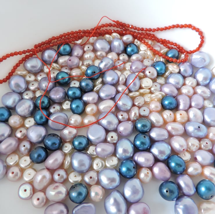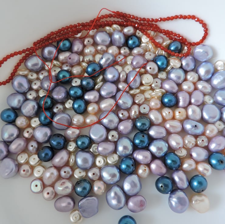An assorted lot of freshwater pearls and faux pearls and a string of very small facetted red beads. All that you see in the photos. To give an idea of size the dark blue ones are 6mm.
