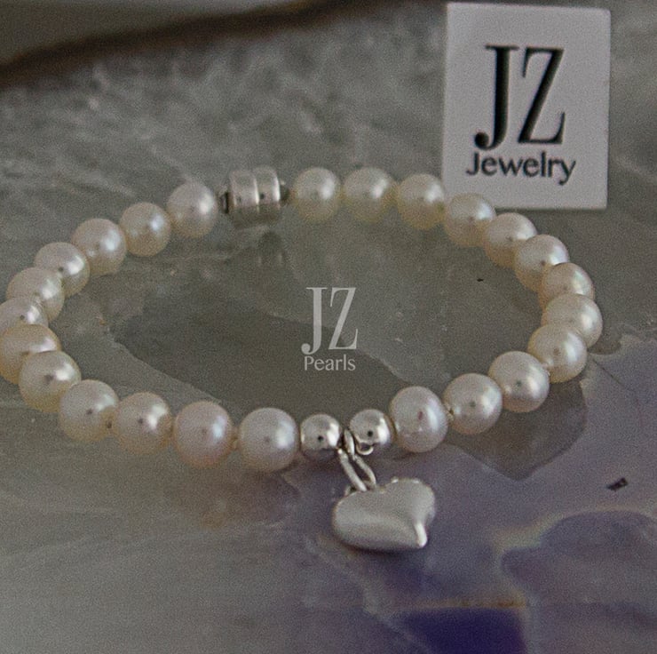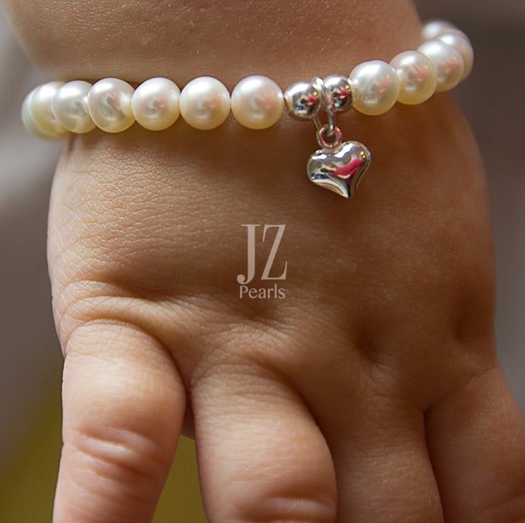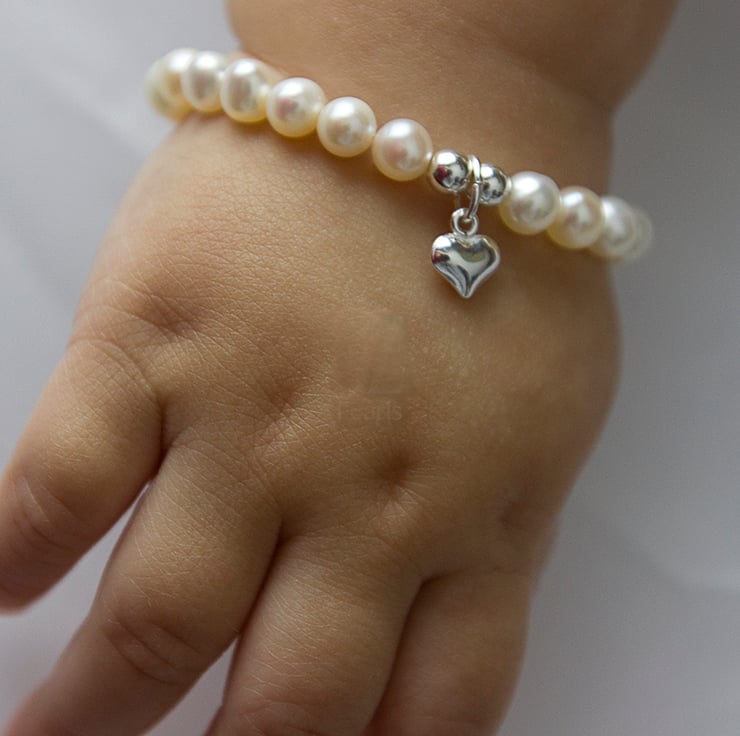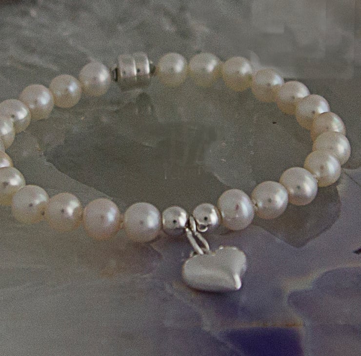 This beautiful Cultured Freshwater Grade AAA 6 mm Pearl Bracelet is designed with a Sterling Silver Heart Charm set between Sterling Silver round beads and fastened with a Sterling Silver magnetic Clasp for ease of fit, making this the ideal 1st Baby Gift and creating a stunning, classic and stylish piece of jewellery for any occasion.