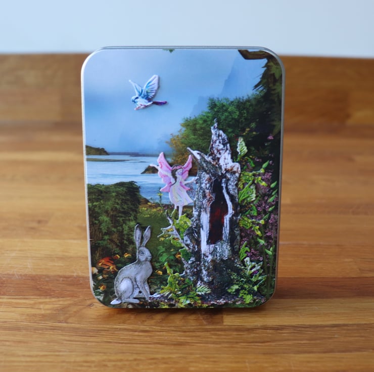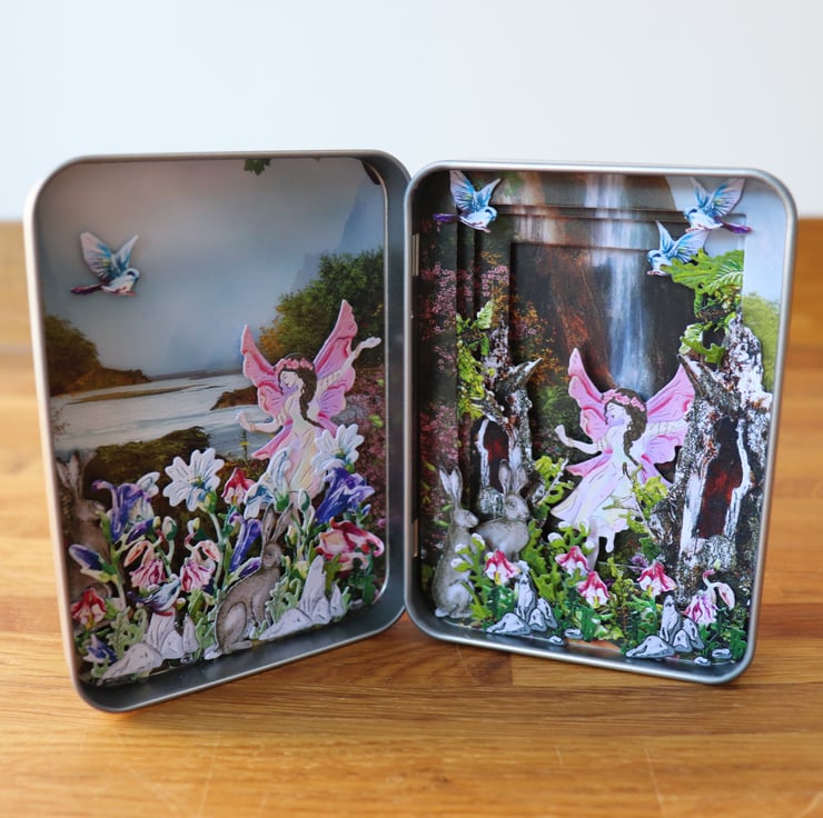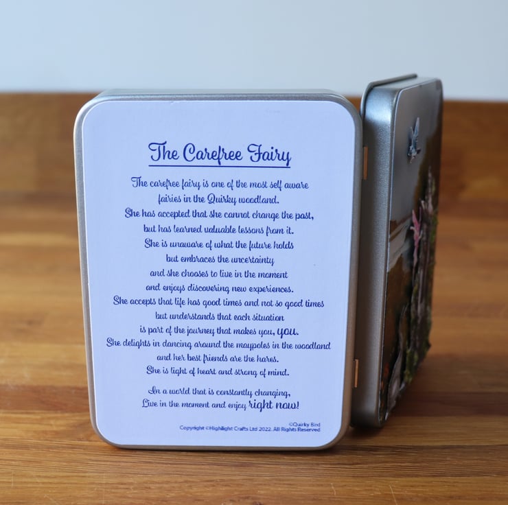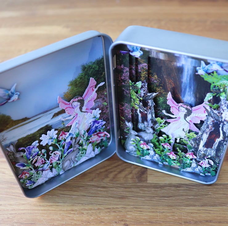 This beautiful Gift is a set of scenes about the carefree fairy, the first scene I have cut as a tunnel view with her dancing through the water surrounded by lush greenery and flowers and all her woodland friends, the second scene is by the river as is the front of the tin, on the the back of the tin is a little story about her.