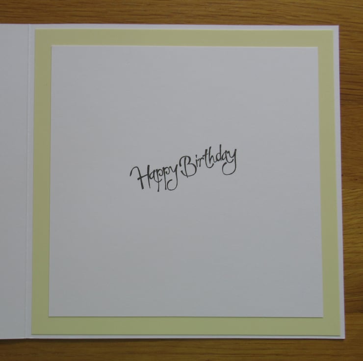 This cute card in peach and brown tones features the lovely image of a kitten and puppy cuddled up together on the door step The image is surrounded by a gold frame which is raised with 3D foam pads upon a pretty peach background card. I have added ribbon down one side of the card and the inside is finished to coordinate with stamped Happy Birthday greeting.