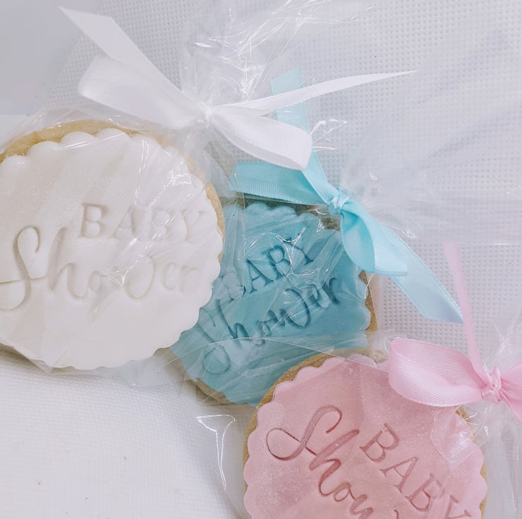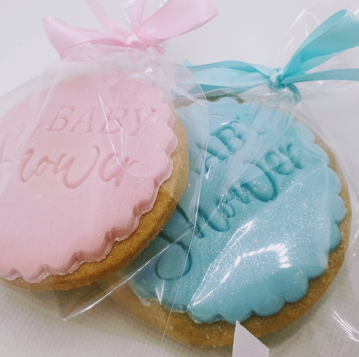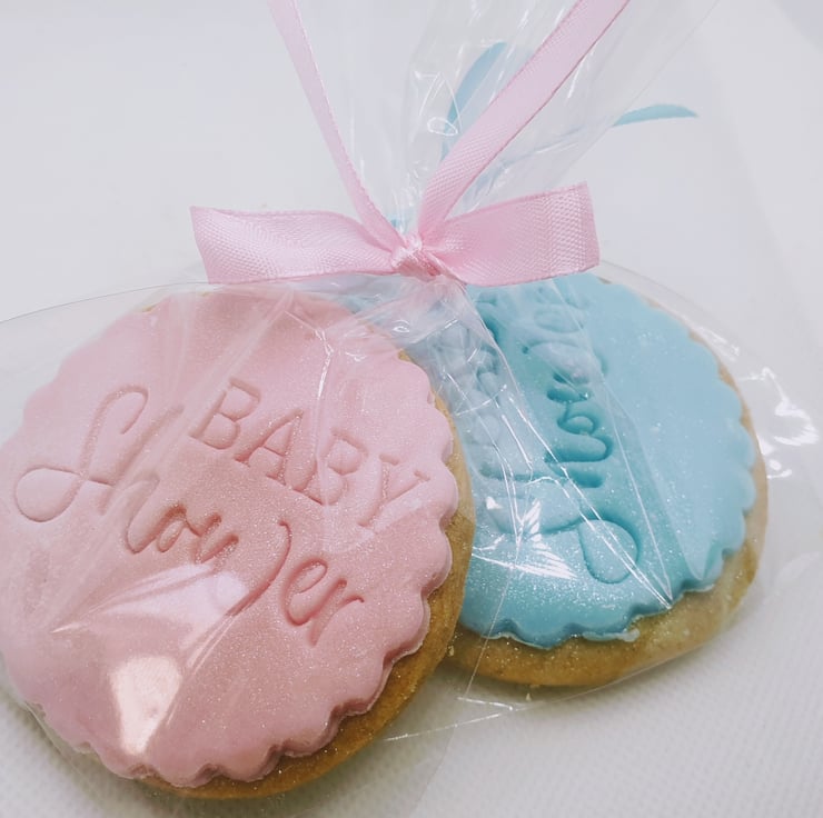 Delicious, crumbly handmade shortbread topped with a sweet layer of icing, with BABY SHOWER individially stamped onto each biscuit plus a touch of shimmer too!