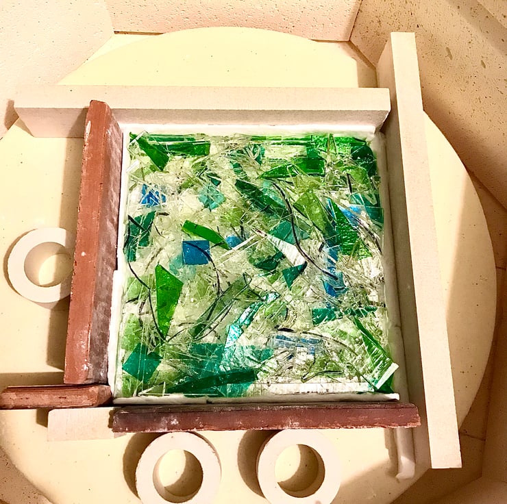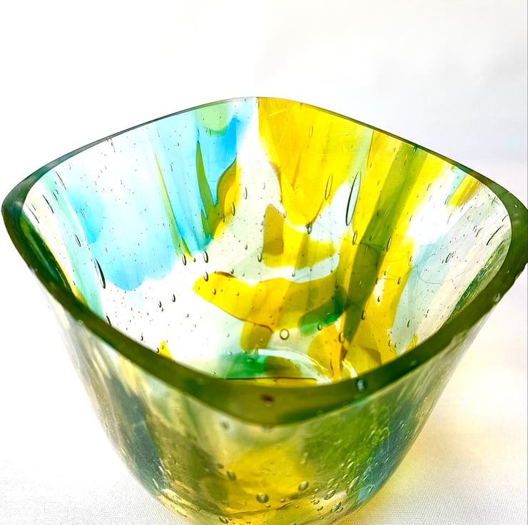 The second firing required me to watch over it, checking regularly to ensure it didn’t drop too far through the mould. It’s a lovely little square vase measuring approximately 75mm high, 90mm wide and 106mm diagonally rim to rim. It’s particularly pretty with a tea light candle inside, but is also perfect as a peanut or sweet dish.