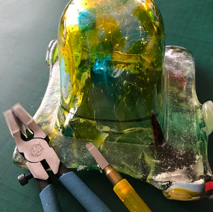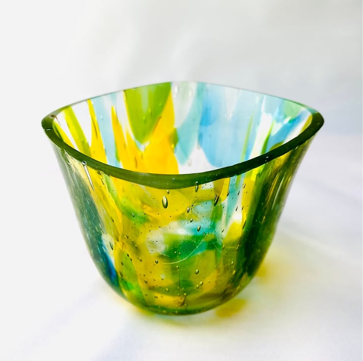 You should note that in the difficult process of removing the excess glass, a small chip on the rim was created, which is highlighted in one of the pictures. I have priced this item to take this into account, meaning you get a unique piece of handmade glass at an exceptionally cheap price, given the hours of work put into creating it.
