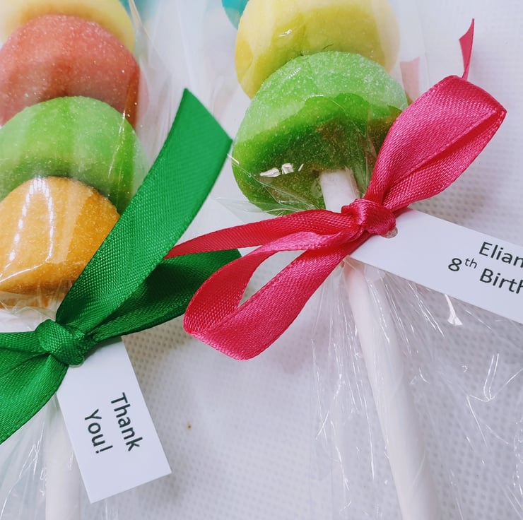 Each lollipop is made up of 5 large sugar coated marshmallows, in a mix of rainbow colours