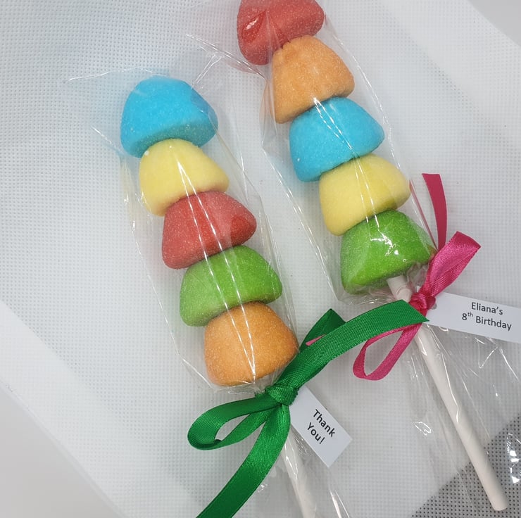 Each lollipop is made up of 5 large sugar coated marshmallows, in a mix of rainbow colours