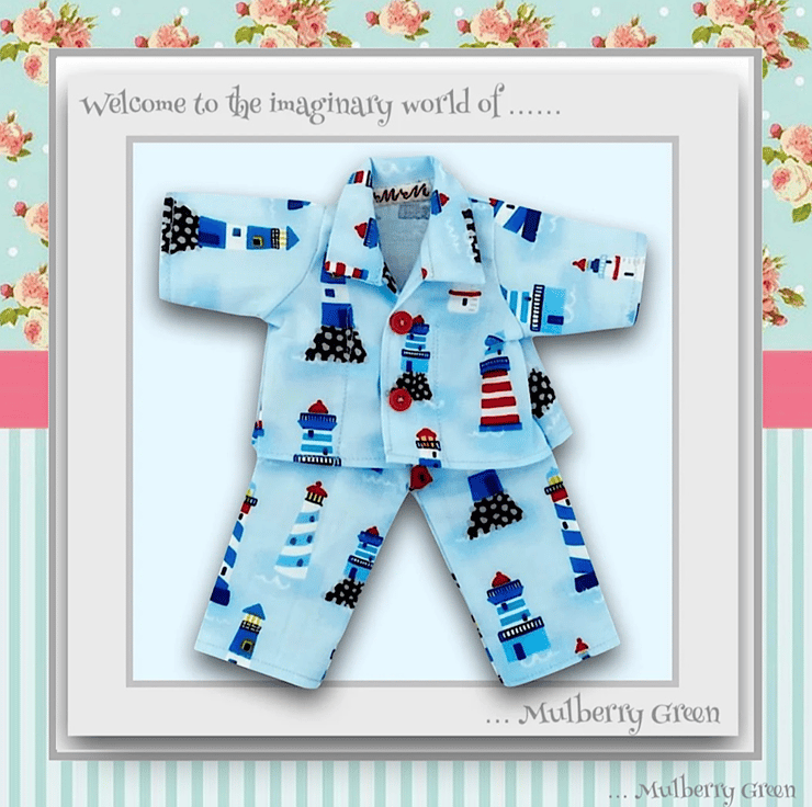 Cute little pyjamas in a lighthouse print, to fit the Mulberry Green characters. The pyjamas are made from best quality cotton and fasten at the front with two little poppers underneath the buttons.