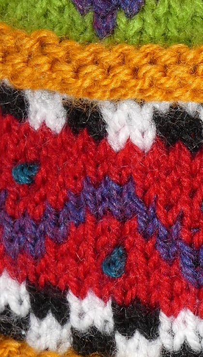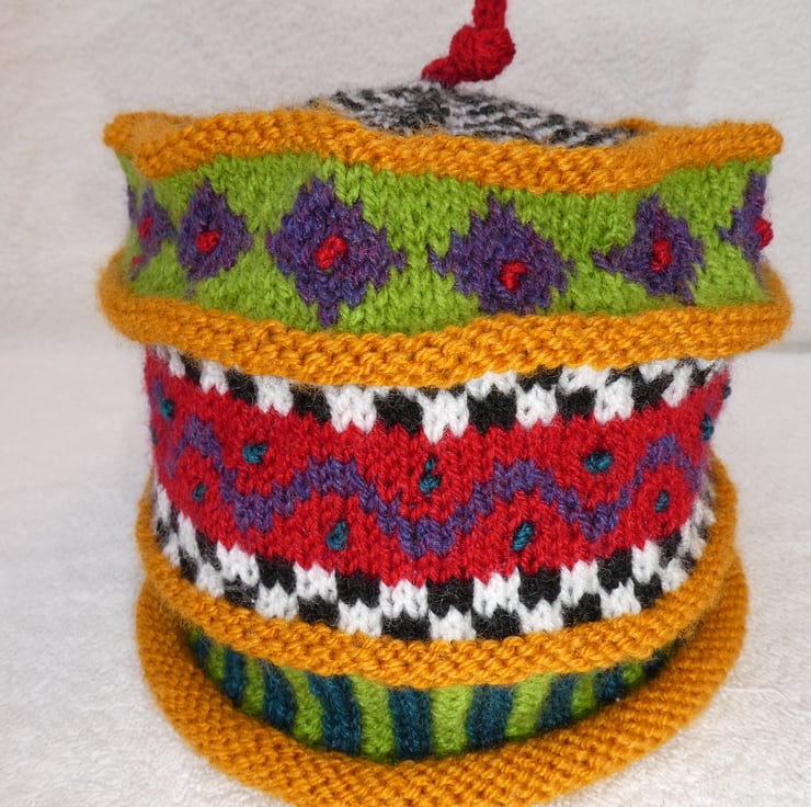I have designed and hand knit this wonderful brightly coloured hat from double knitting weight premium acrylic yarn, using fair isle techniques. The hat has a roll up brim, 2 colour rib, garter ridges and fair isle panels. There are decorative French knots and an i-cord top knot to complete the hat. It is knit in the round, so there are no seams.