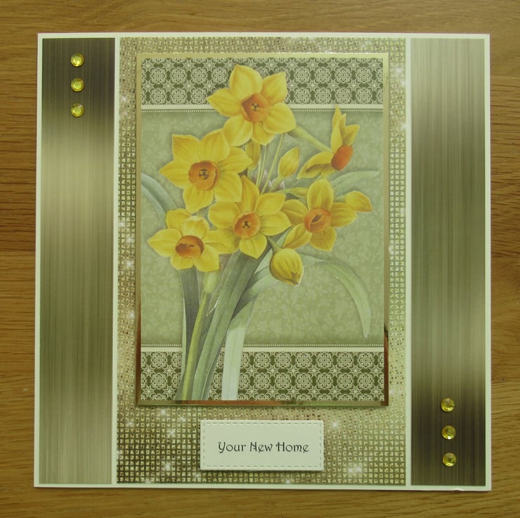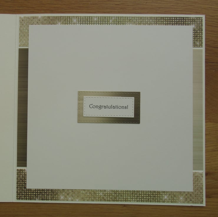 A lovely card in sage green and yellow. The image of a bunch of daffodils has a frame of gold mirror card which has been raised with 3D foam pads, as has the greeting. Faux gems have been added for decoration and the inside has been finished to coordinate with a congratulations message.