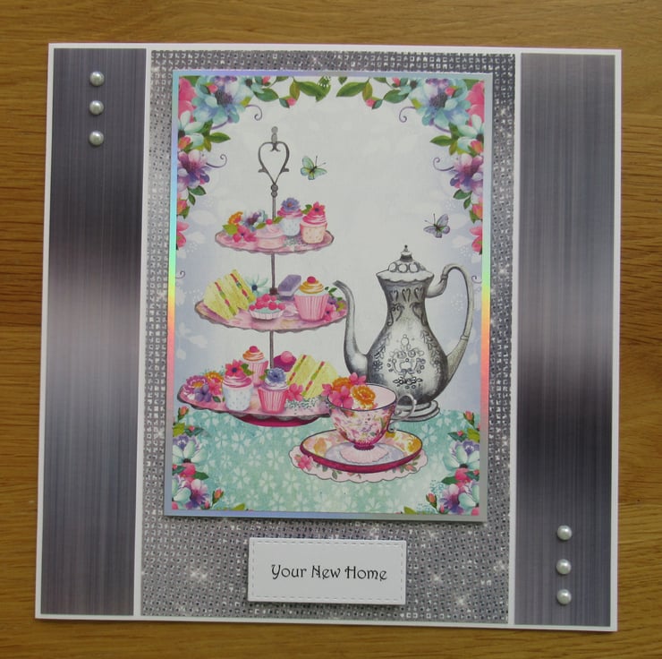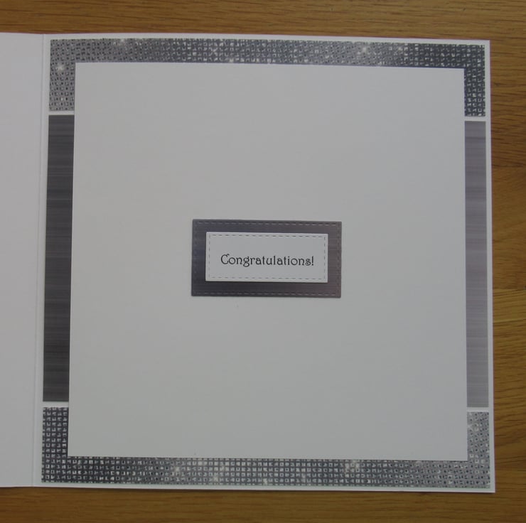 A lovely card in a steel blue/grey colourway. The image of a table set for afternoon tea has a frame of silver mirror card which has been raised with 3D foam pads, as has the greeting. Faux pearls have been added for decoration and the inside has been finished to coordinate with a congratulations message.