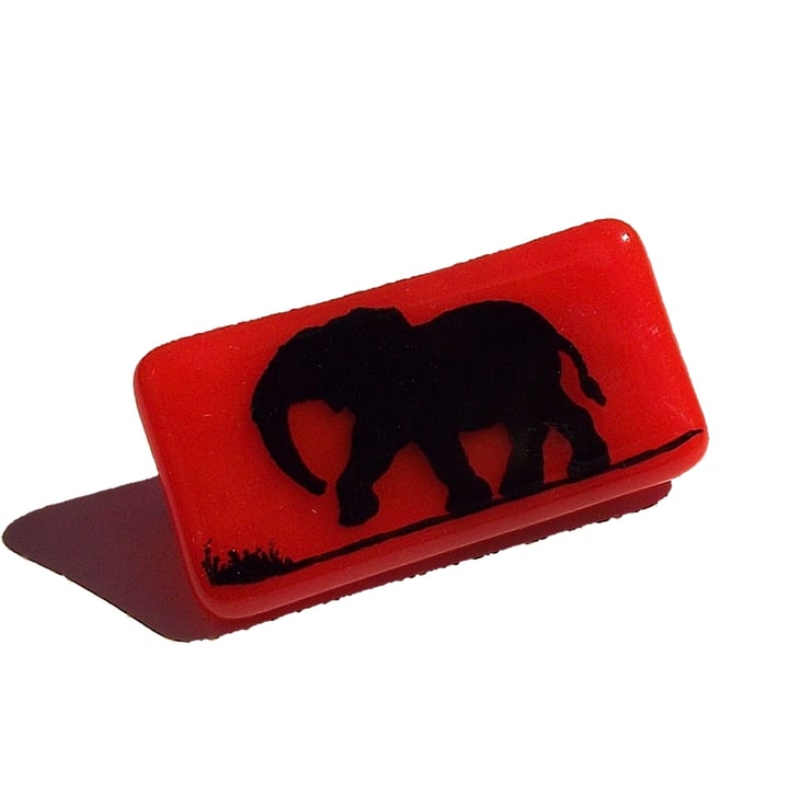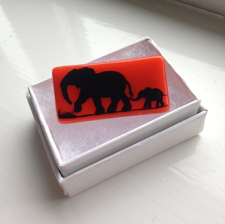These brooches are handmade from opaque coloured flat glass with an elephant silhouette design, hand screen printed in kiln fired enamel onto the surface. After firing, it is carefully digitally cooled for strength and safety, before being mounted on a nickel-free silver plated brooch finding and come in a gift box with a story card.