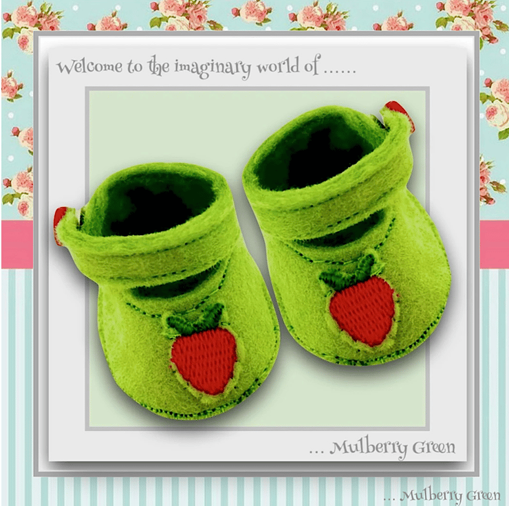 A cute little pair of embroidered strawberry shoes. They fasten with a little popper underneath a button.