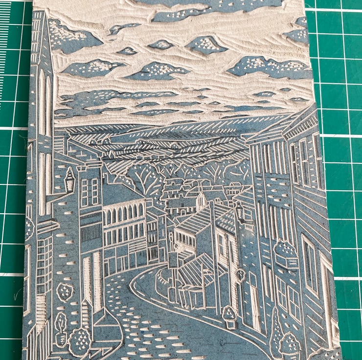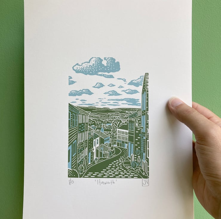 A 2-colour hand-printed linocut/screen-print entitled 'Haworth'.