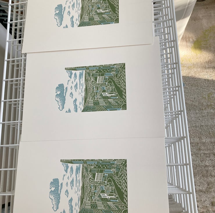 Dark green and light blue System 3 inks on off-white 220gsm acid-free paper. From an edition of 80, signed, titled and numbered. I created the image initially as a linocut print, and then transferred the image to a silk-screen to hand-print the edition.