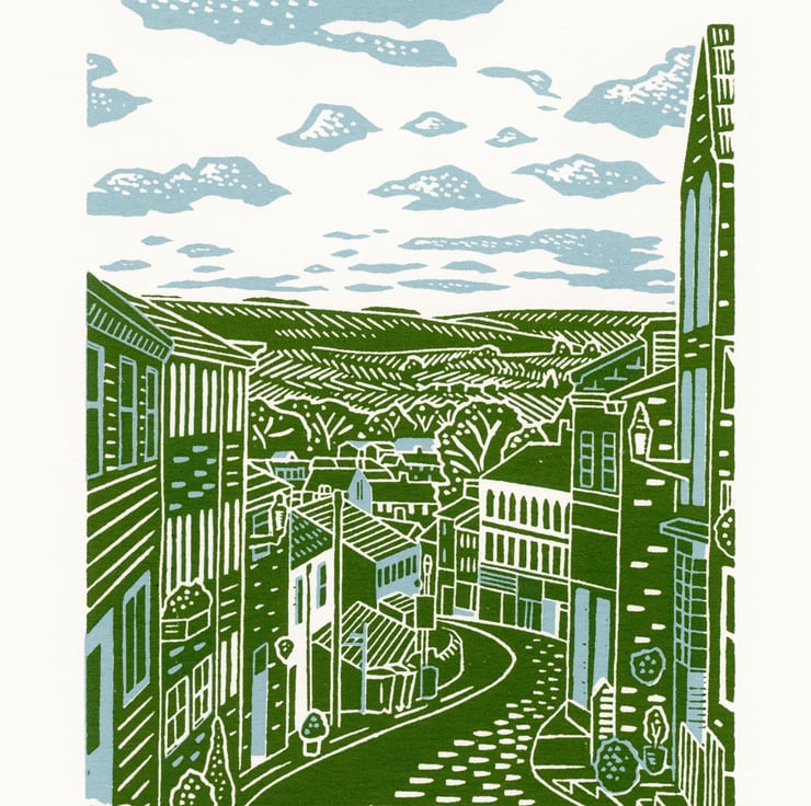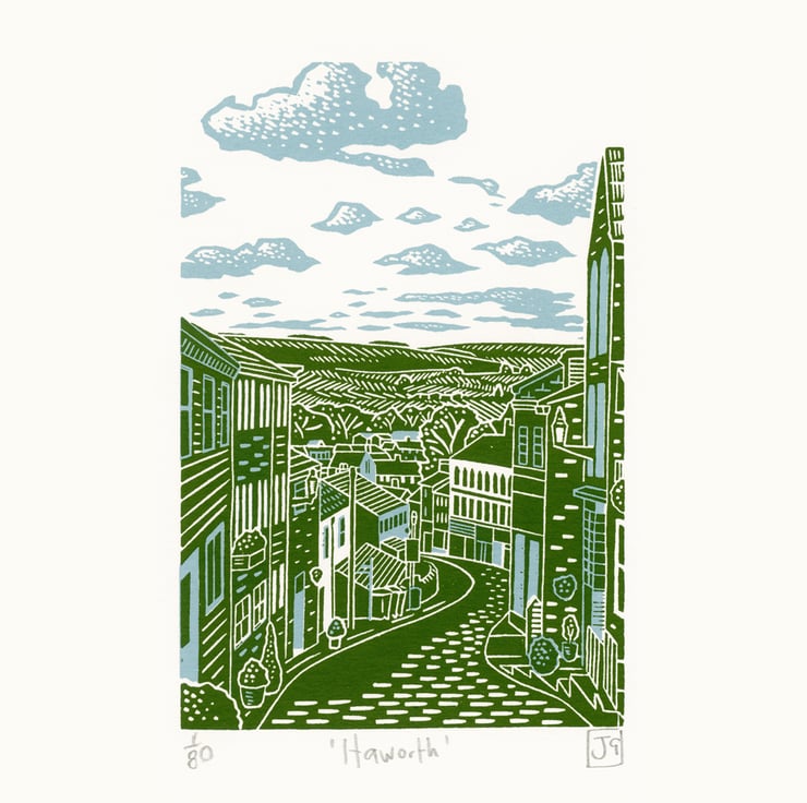 This is a print of a small village of Haworth in West Yorkshire. It is in the Pennines, just ten miles from Bradford, and famously the home of the Brontë sisters, who all lived there and wrote most of their books there whilst their father was parson of the local church! It is a beautiful place, the landscapes clearly evocative of their famous literature. My print is looking down Main Street in the centre, down the cobbled road, past the shops, cafes and houses, with the hills in the background.