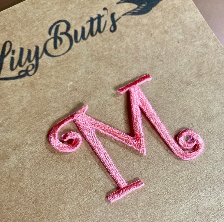 Embroidered Iron on Patch, Letter M, Coral Pink, 3.4 cm x 3.7 cm