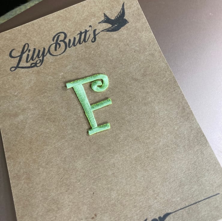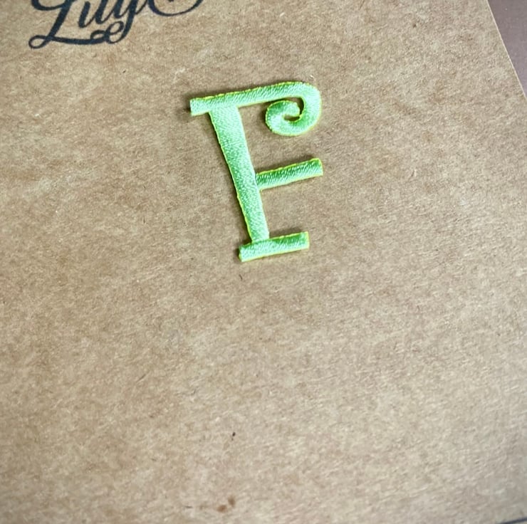 Embroidered Iron on Patch, Letter F, purple and yellow 2.5cm x 3.5 cm.