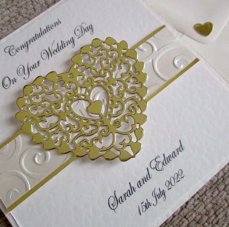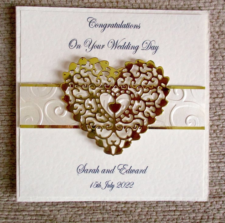 Created from a ivory hammer card with a flourish embossed pearlescent ivory and gold metallic card strip, layered onto ivory hammer paper, printed with the text "On your Wedding Day" at the top and your own personalisation requirements printed at the bottom.