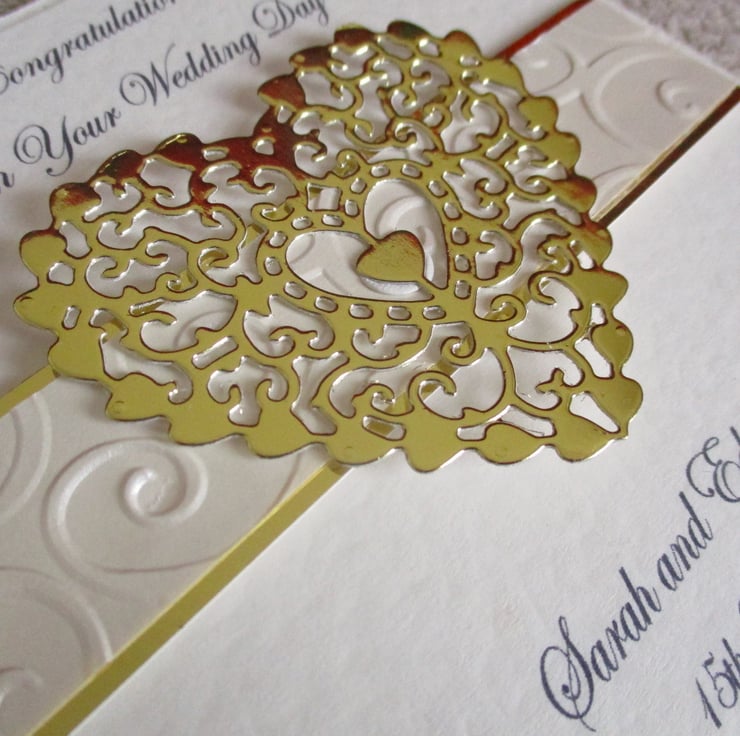 The main feature is a die cut large metallic gold mirror card intricate heart.