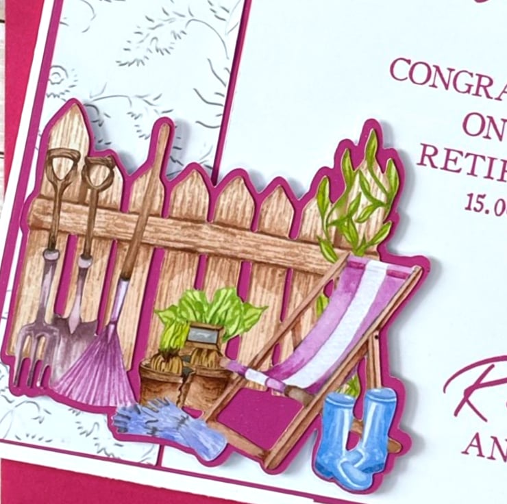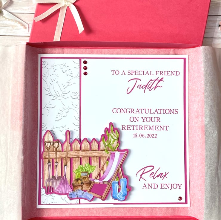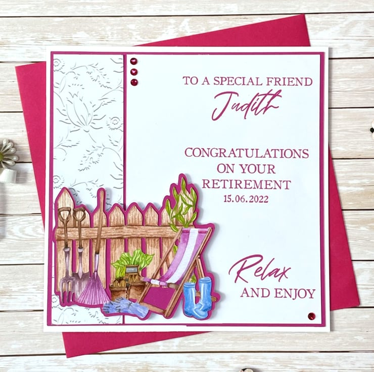 The image is of a pink, stripy deckchair, surrounded by gardening equipment, gloves and wellies, with the wording "Congratulations on your Retirement, Relax and Enjoy" beside it. The card can be personalised with any text, name, relation and date.