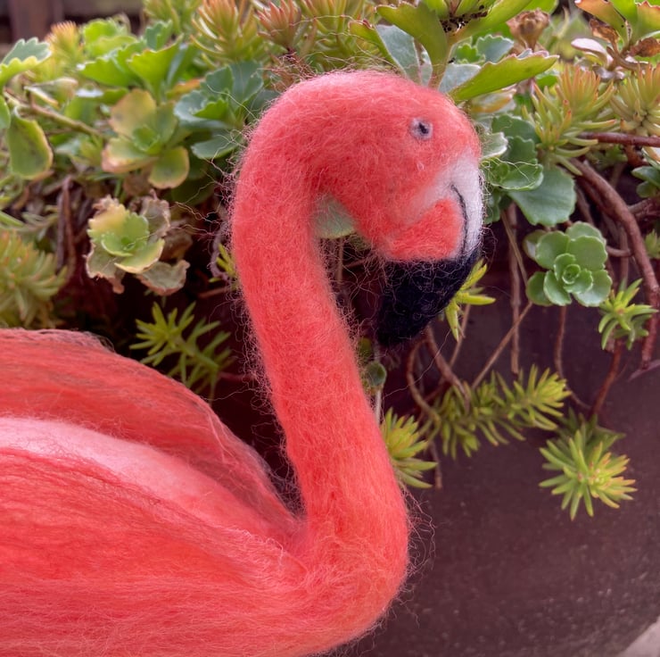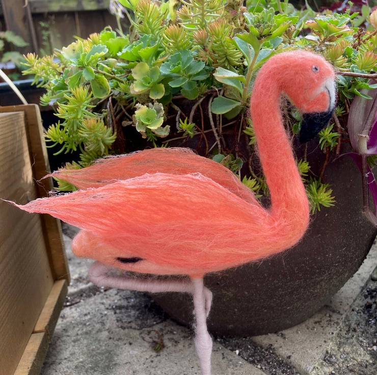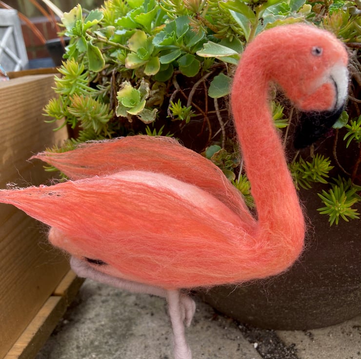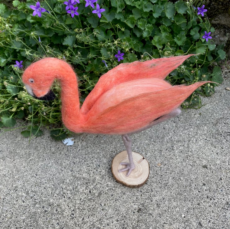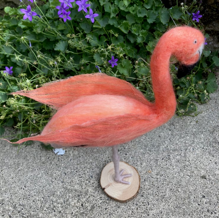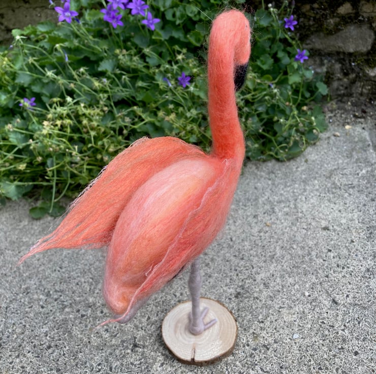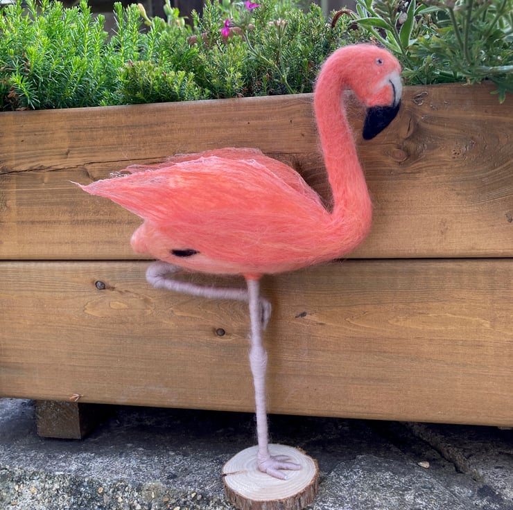 This flamingo has been needle felted using woollen fibres and a barbed felting needle. Core woollen fibres form the basic shape which has then been covered in a coloured merino wool fibres that have been hand blended. A central piece of wire supports the neck. The wings are made from woollen fibres that have been stiffened with a PVA glue which holds the thin layer of fibres together. He is posed standing on one leg, the standing leg is formed using wool wrapped around a wooden skewer to provide strength and the flamingo is mounted on a small rustic wooden slice to aid stability.