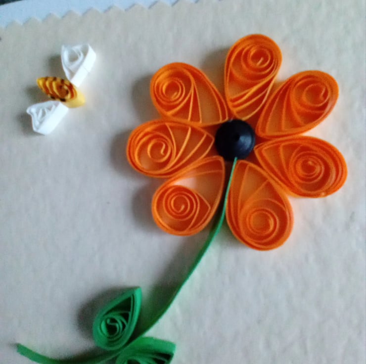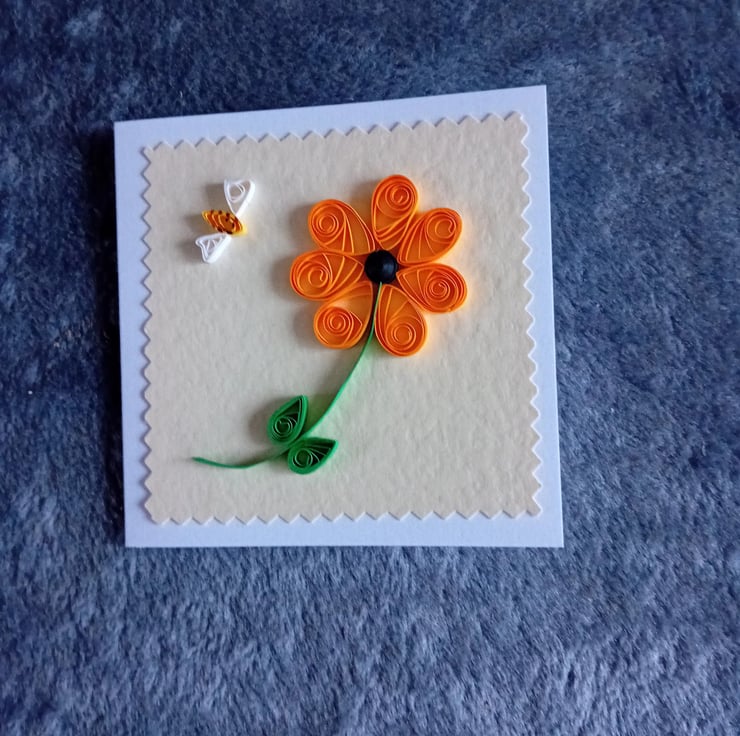 A quilled Daisy and Bee greetings card, measuring 4x4 inch, with a matching envelope. Made with 3mm paper strips in green, orange, white and black. All rolled, shaped and glued in place on a yellow card with a zig zag edge. Will be sent in a padded envelope by Royal Mail 2nd class.