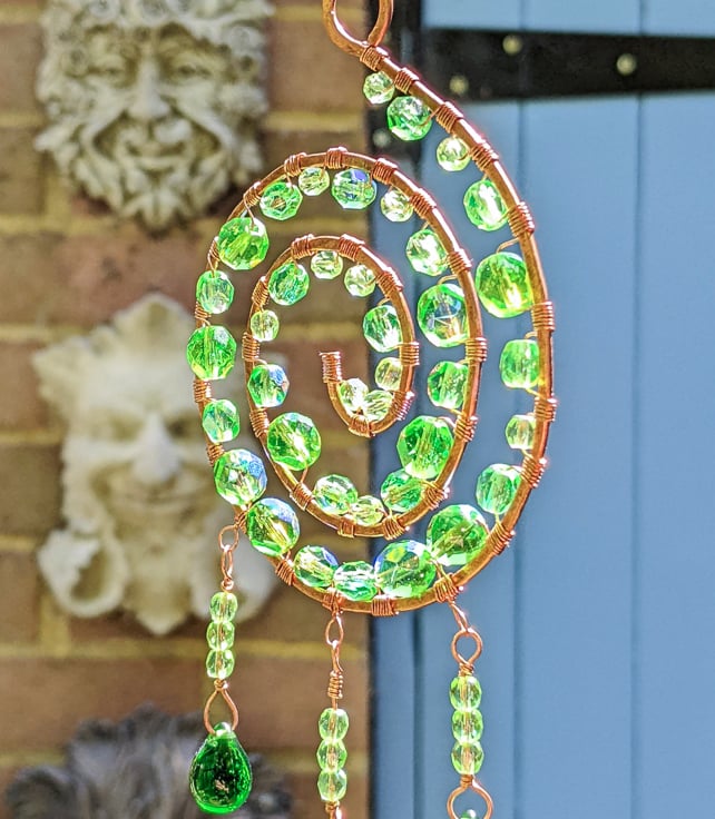 This unique design has been made with 99.9% pure copper wire in various thicknesses. The main body is hammered to strengthen it and then the beads are wire wrapped onto the main spiral.