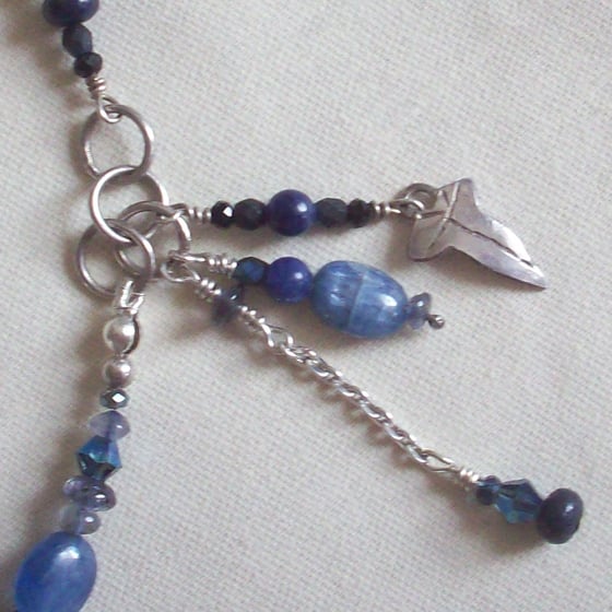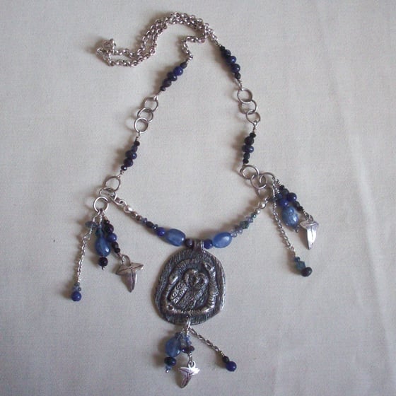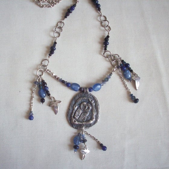 A wise old owl looks out of a tree at the witching hour of midnight. Carefully carved for you from 999% pure silver clay, and strung on a chain of silver, hand-made chain and beautiful gemstones in tones of blue. A few tiny faceted glass glass beads and man-made Blue Goldstone add sparkle.Your gemstones from Mother Nature are Kyanite, Lapis Lazuli, Sodalite, Iolite. Charms of silver ivy leaves hand down with the other adornments. The central pendant is 7 cm including the drops and 3 cm wide. The necklace is 45 cm long. Thanks for looking and for supporting hand-made!