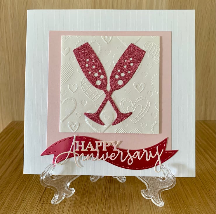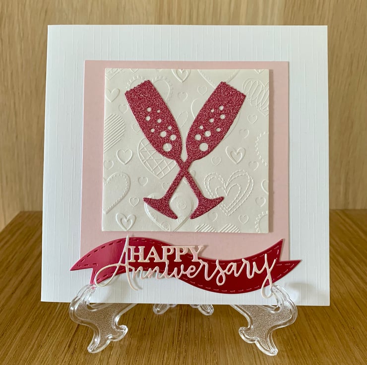 This is a pretty Happy Anniversary Card, made using die cut and embossed pieces, all of which are set onto a linen effect white card! measuring approximately 15 x 15cm, 300gsm.
